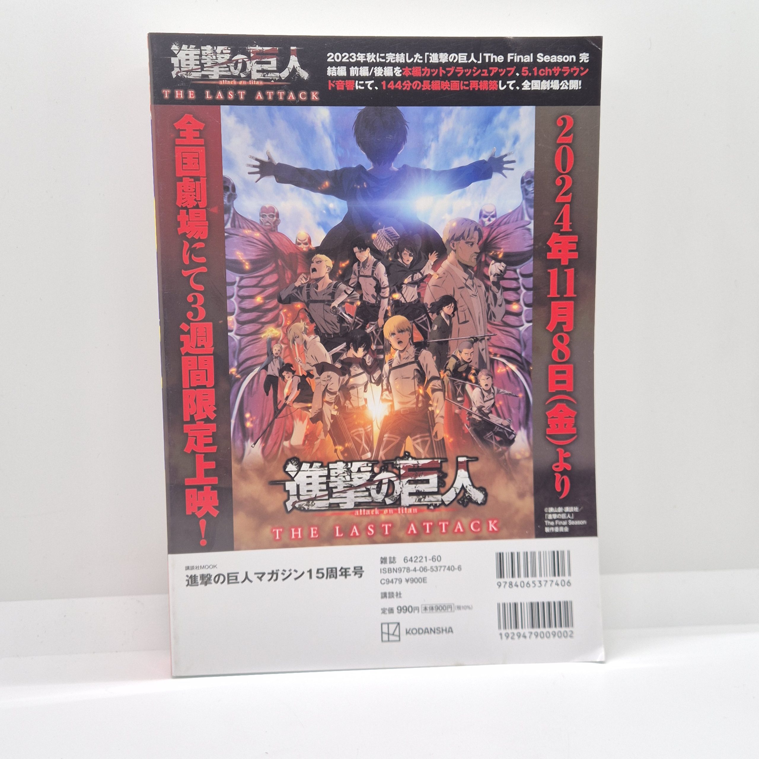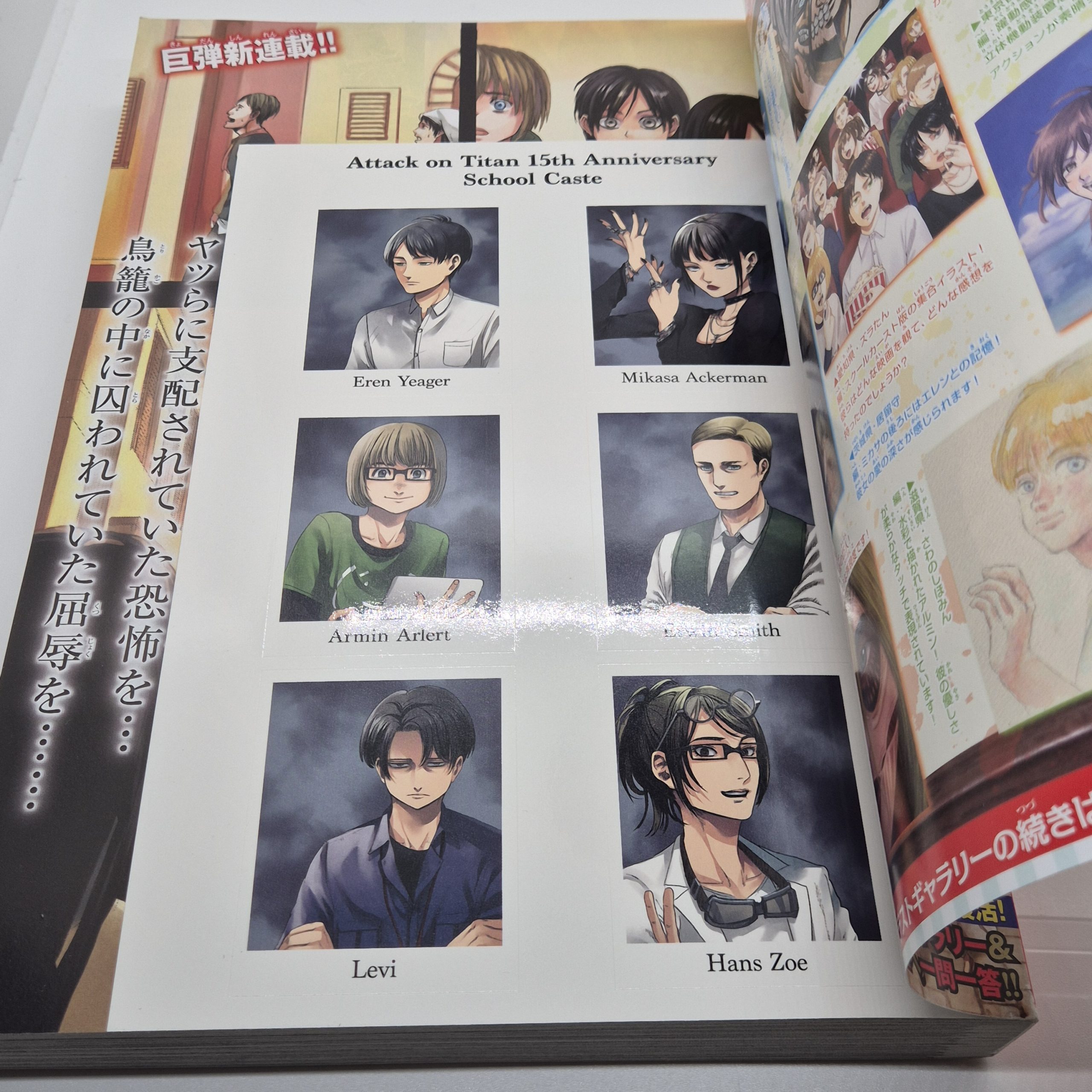 Per celebrare il 15º anniversario di Attack on Titan, Kodansha ha pubblicato un magazine commemorativo imperdibile per ogni appassionato della serie. Questo volume giapponese speciale, rilasciato il 6 novembre 2024, riprende il formato del Bessatsu Shonen Magazine, la rivista originale in cui il manga è stato serializzato, offrendo un’esperienza nostalgica e autentica.