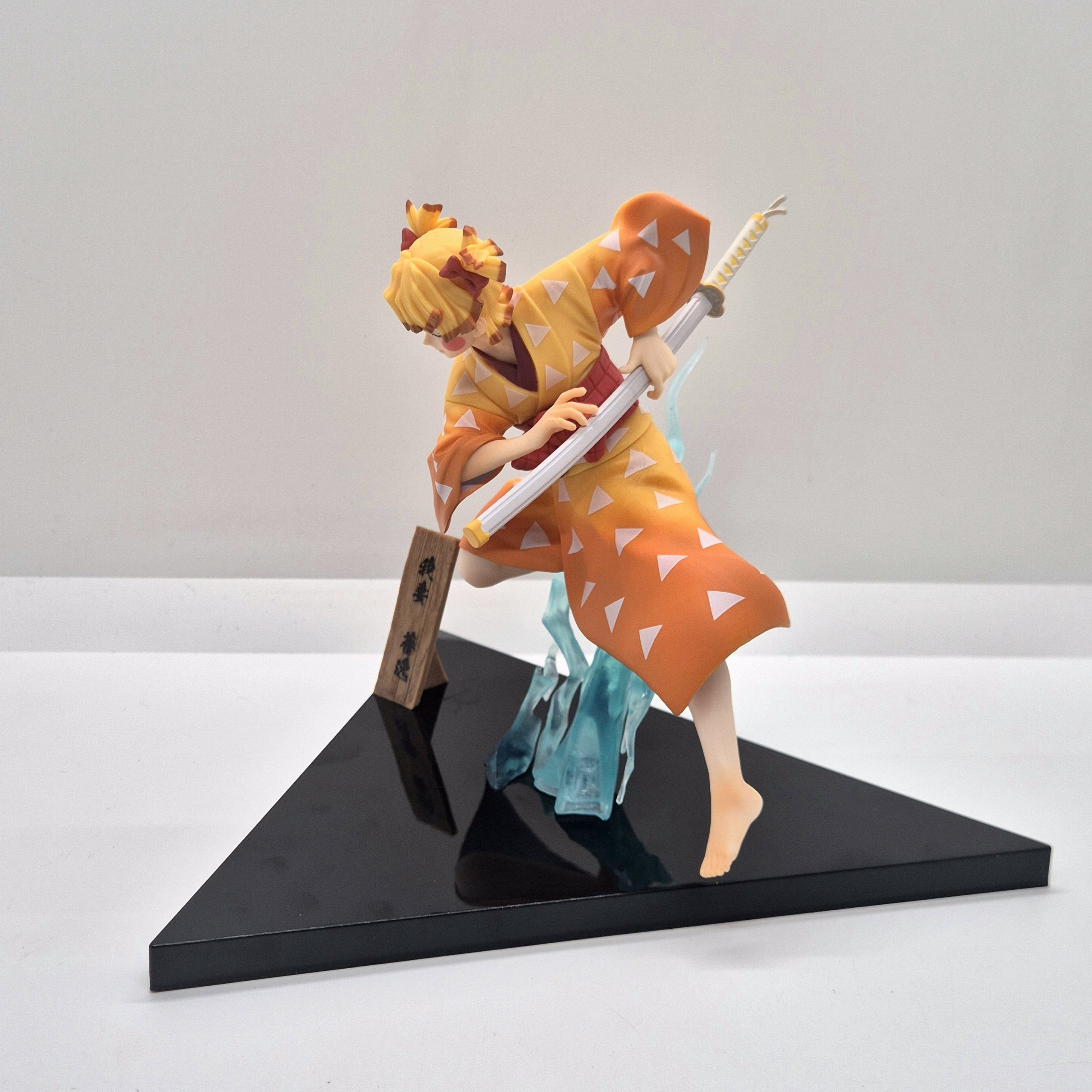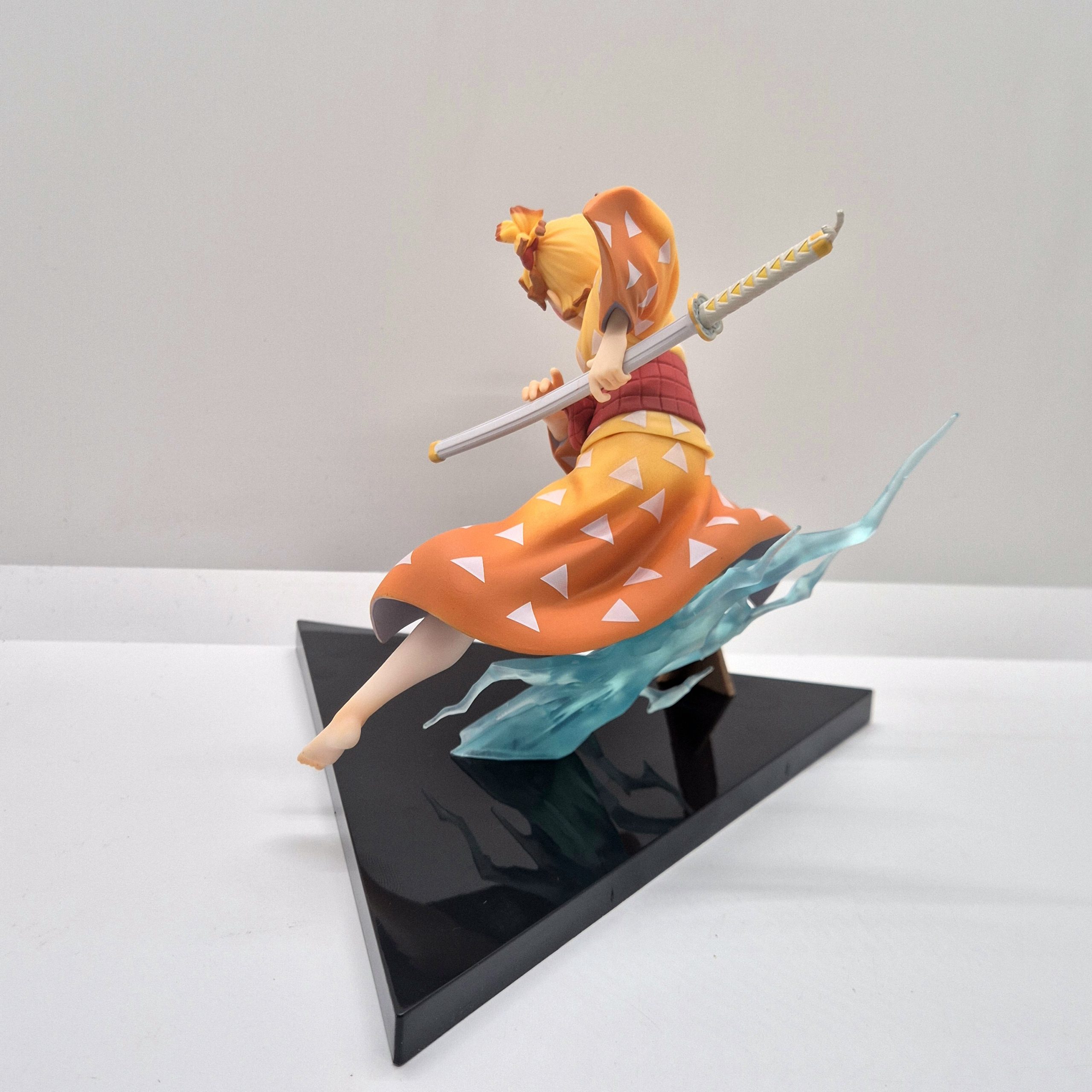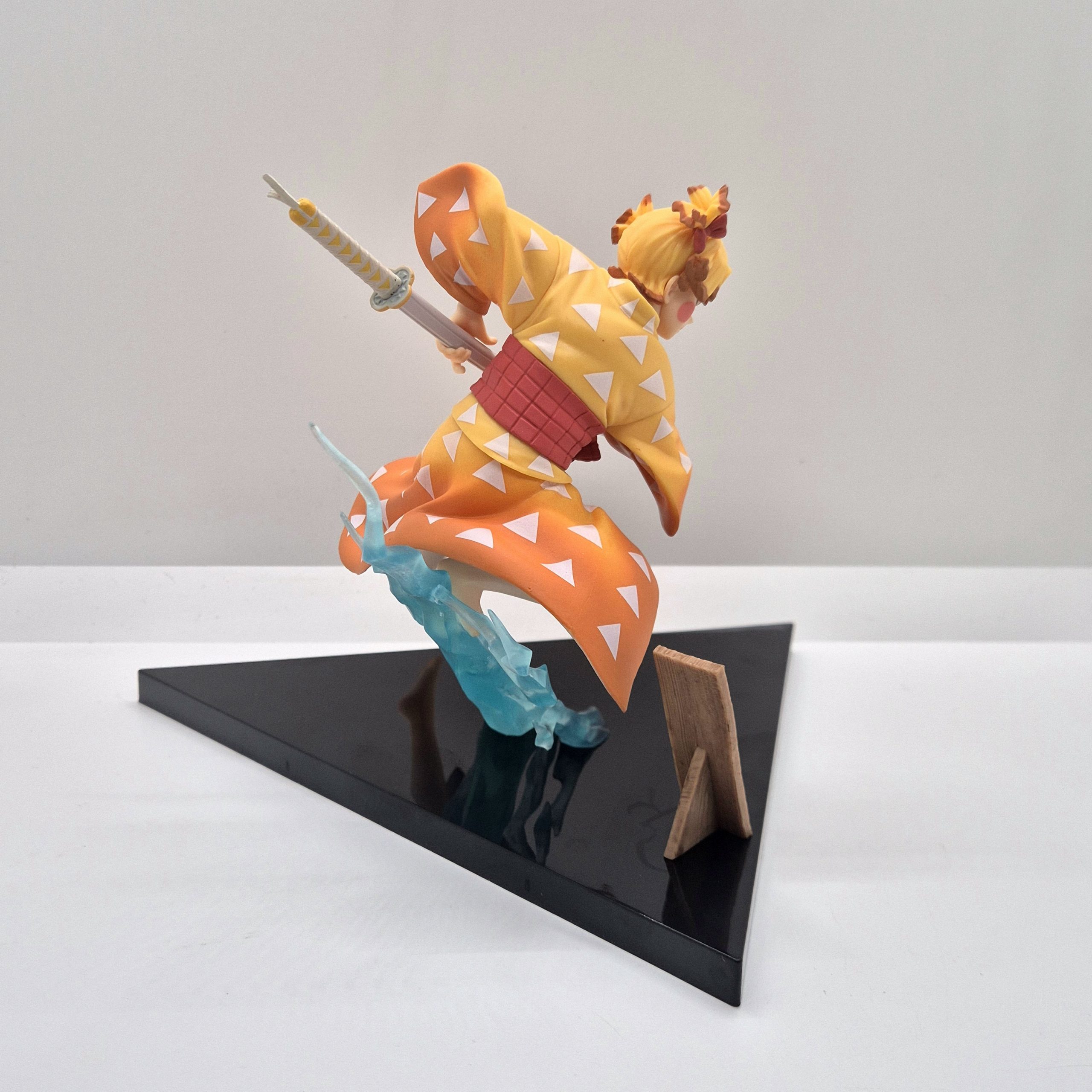 Alta circa 13 cm, la statuetta raffigura Zenitsu in un momento di tensione, pronto al combattimento: la sua spada è saldamente impugnata, le gambe piegate in una posa dinamica, come se stesse per sferrare l’icona mossa del “Thunder Breathing”. La scultura rende onore alla drammaticità del personaggio: i capelli biondi con punte scure, il kimono classico e l’haori giallo a triangoli sono fedelmente dettagliati, mentre l’espressività del volto racconta la dualità tra paura e coraggio che lo contraddistingue.