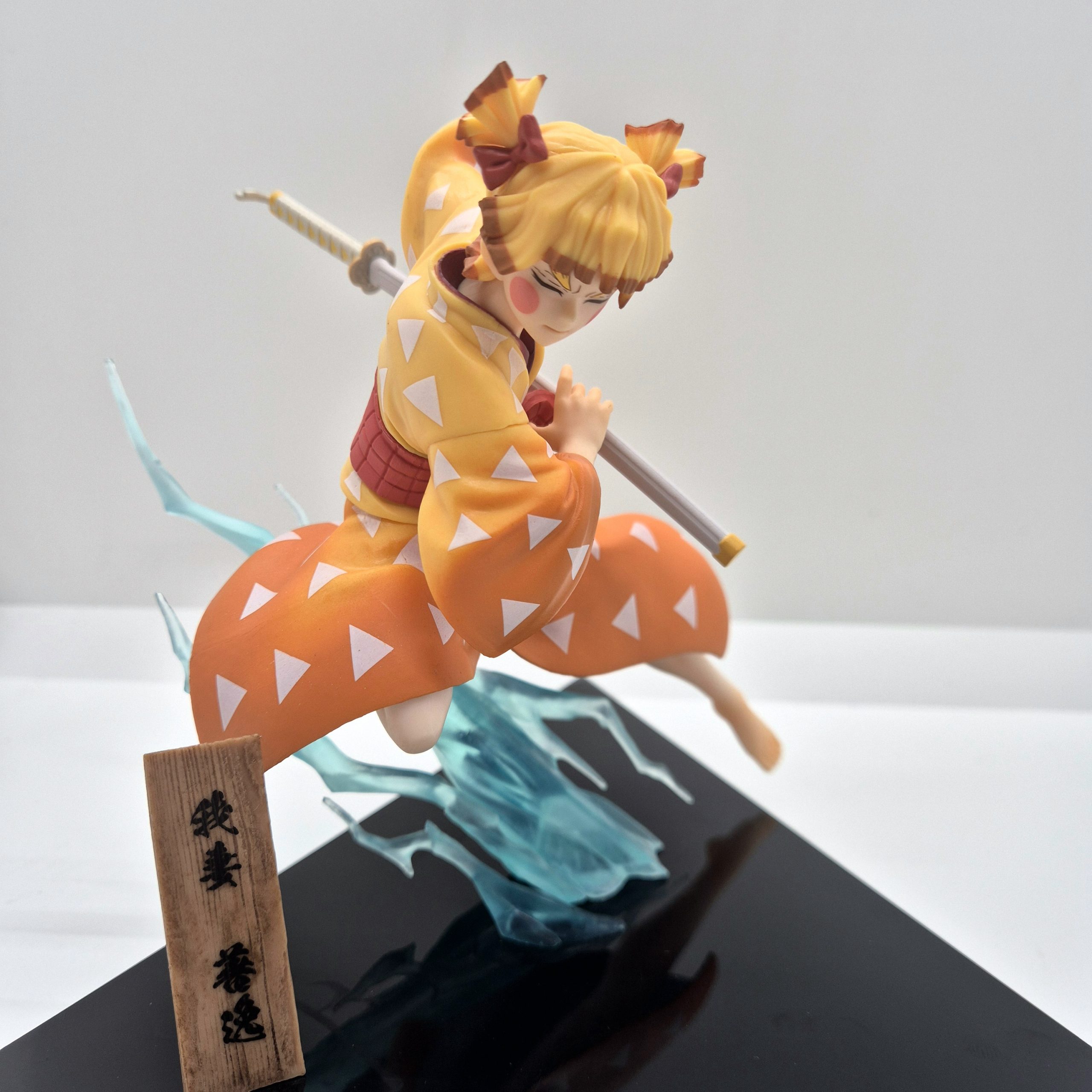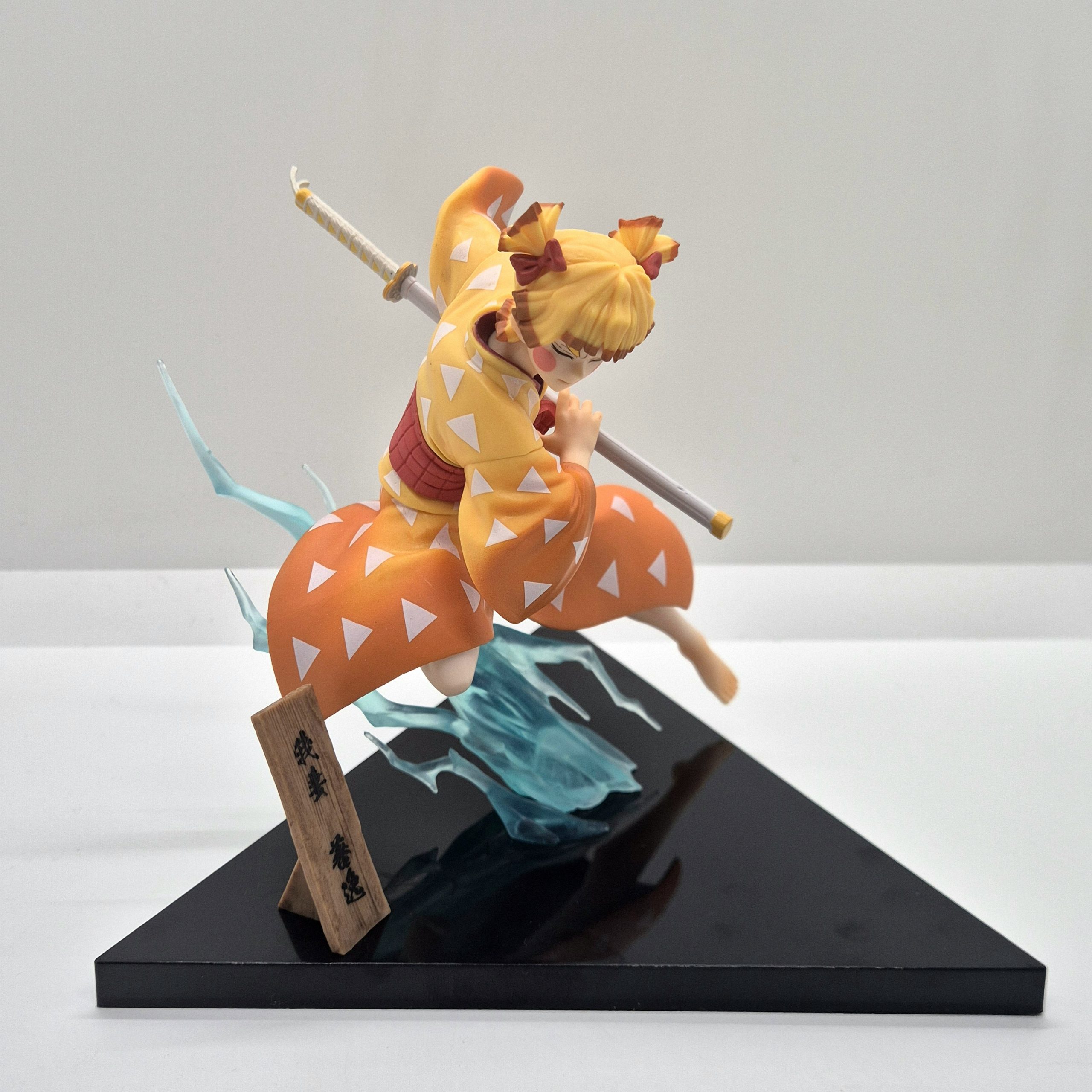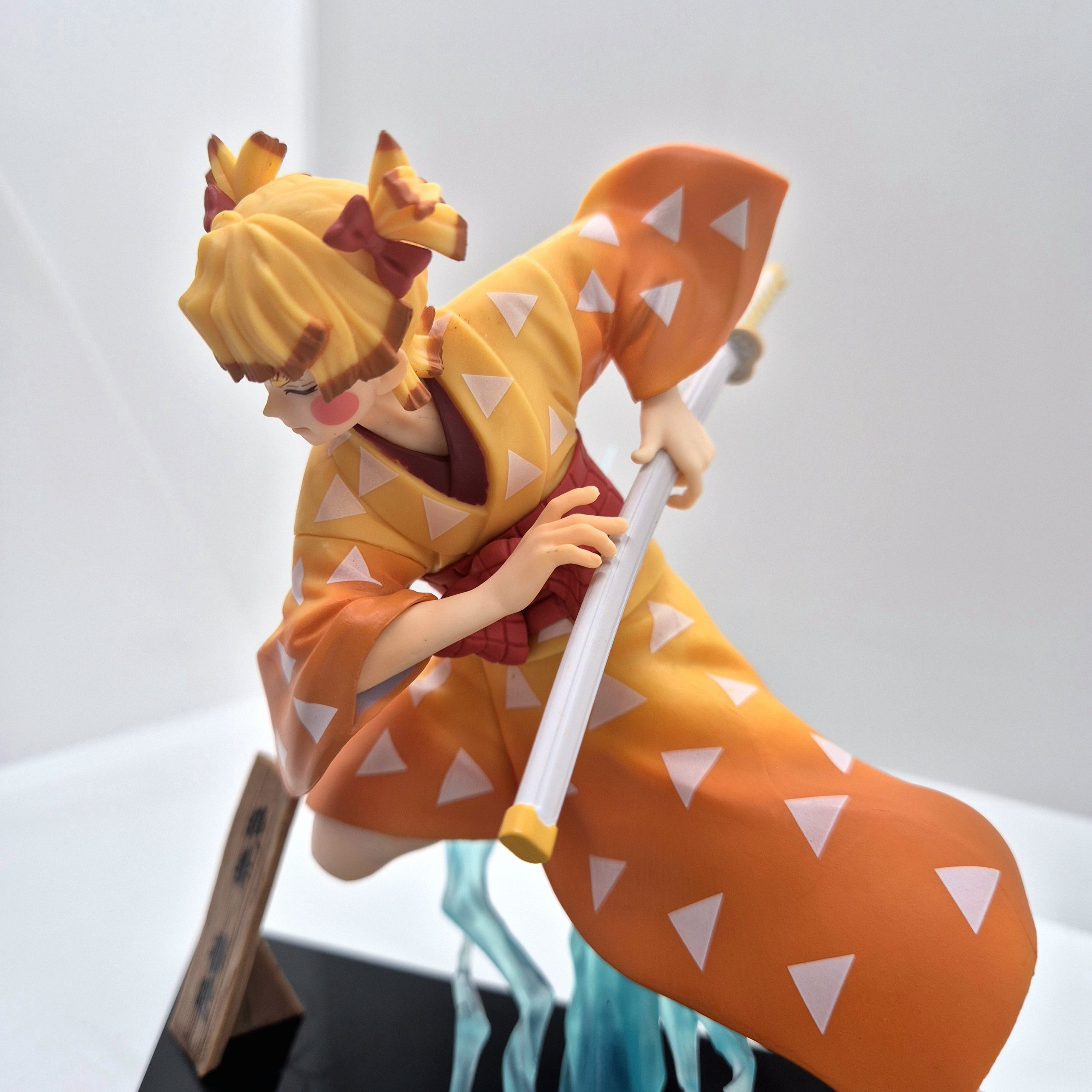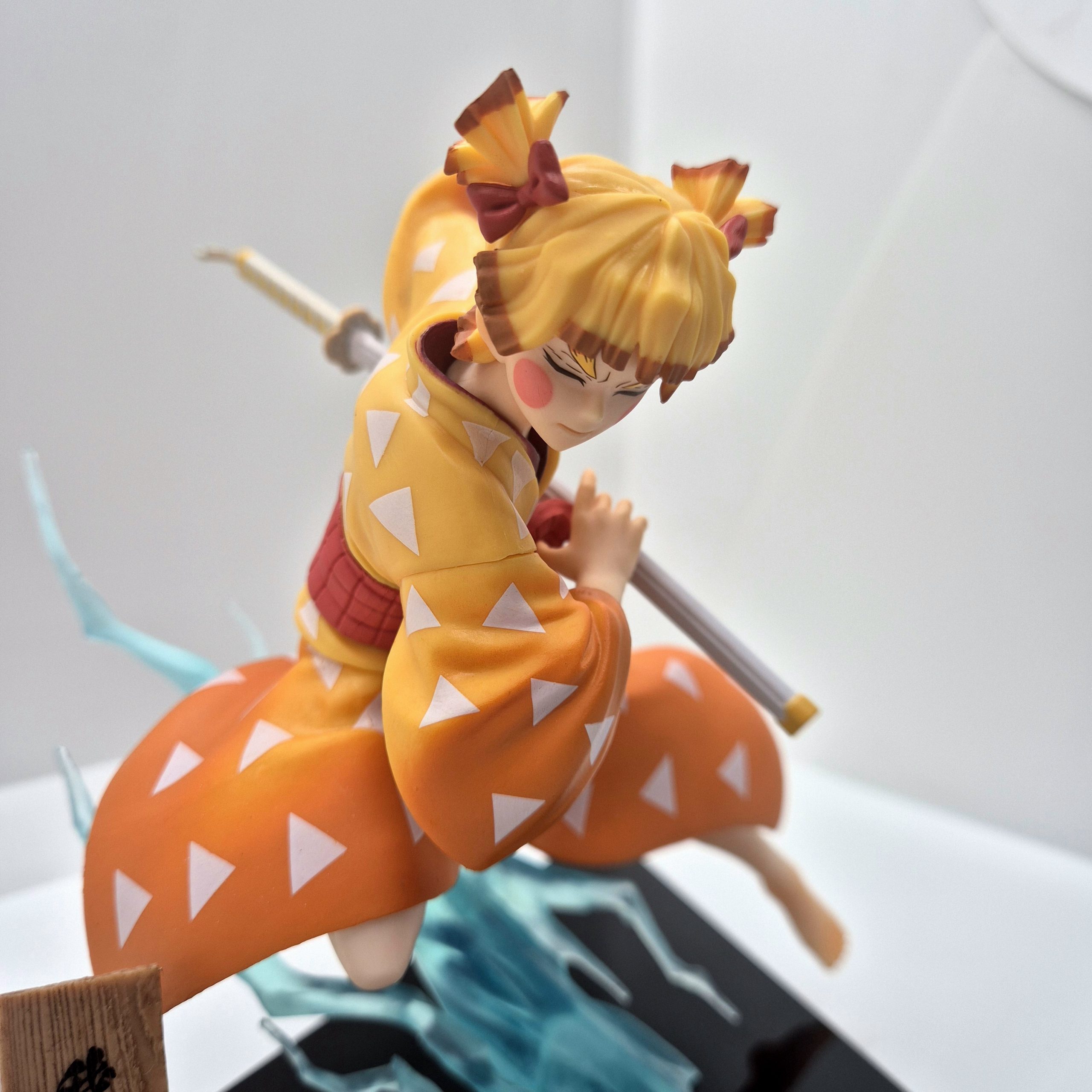 Alta circa 13 cm, la statuetta raffigura Zenitsu in un momento di tensione, pronto al combattimento: la sua spada è saldamente impugnata, le gambe piegate in una posa dinamica, come se stesse per sferrare l’icona mossa del “Thunder Breathing”. La scultura rende onore alla drammaticità del personaggio: i capelli biondi con punte scure, il kimono classico e l’haori giallo a triangoli sono fedelmente dettagliati, mentre l’espressività del volto racconta la dualità tra paura e coraggio che lo contraddistingue.