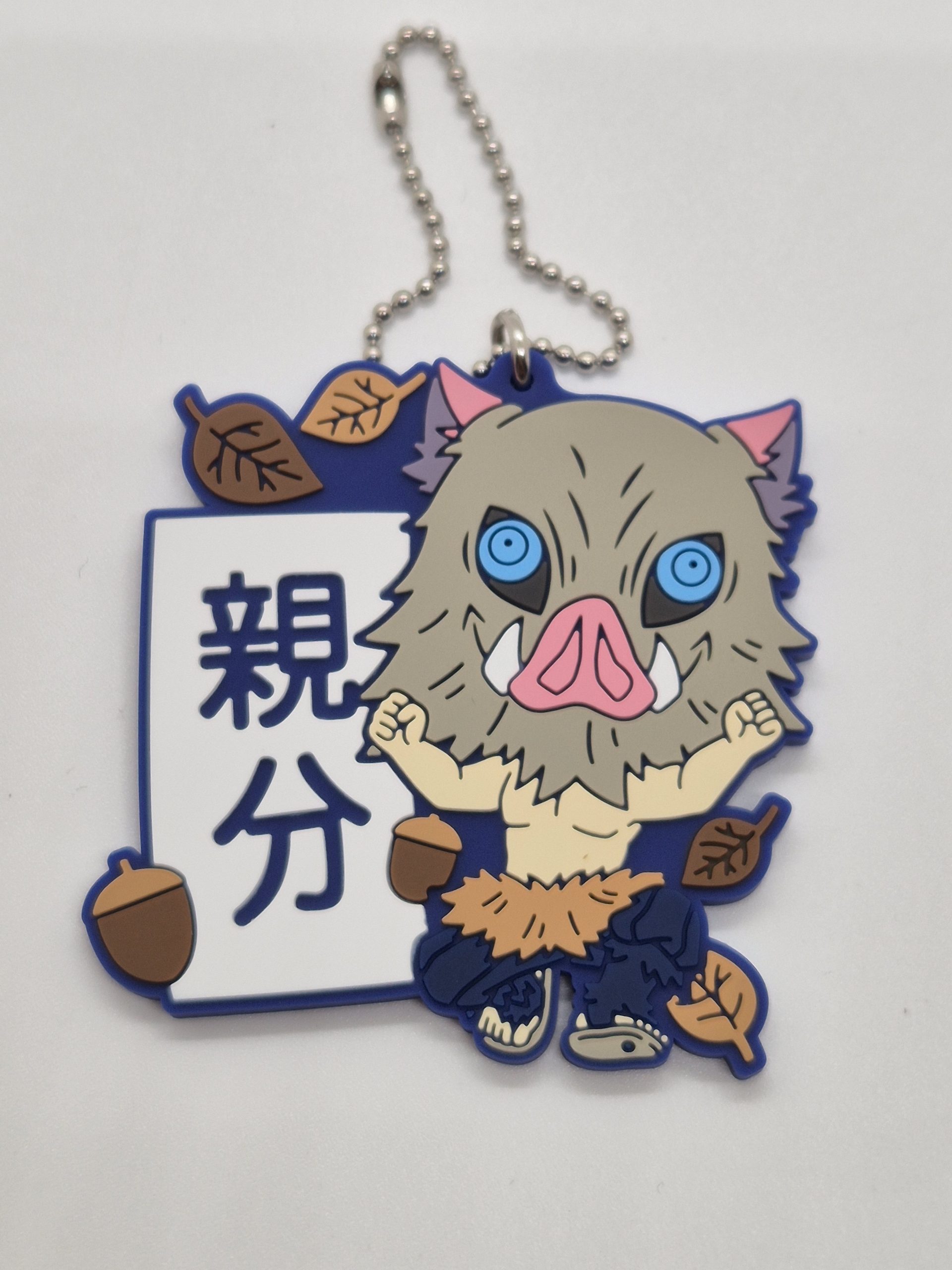 Inosuke Hashibira è immediatamente riconoscibile per la sua caratteristica maschera da cinghiale, che indossa per coprire il suo volto, rivelando solo i suoi occhi determinati e aggressivi. Questo portachiavi riproduce fedelmente la maschera dettagliata di Inosuke e anche la sua muscolatura e postura, simboli del suo spirito combattivo, sono rappresentate in miniatura con grande cura.
