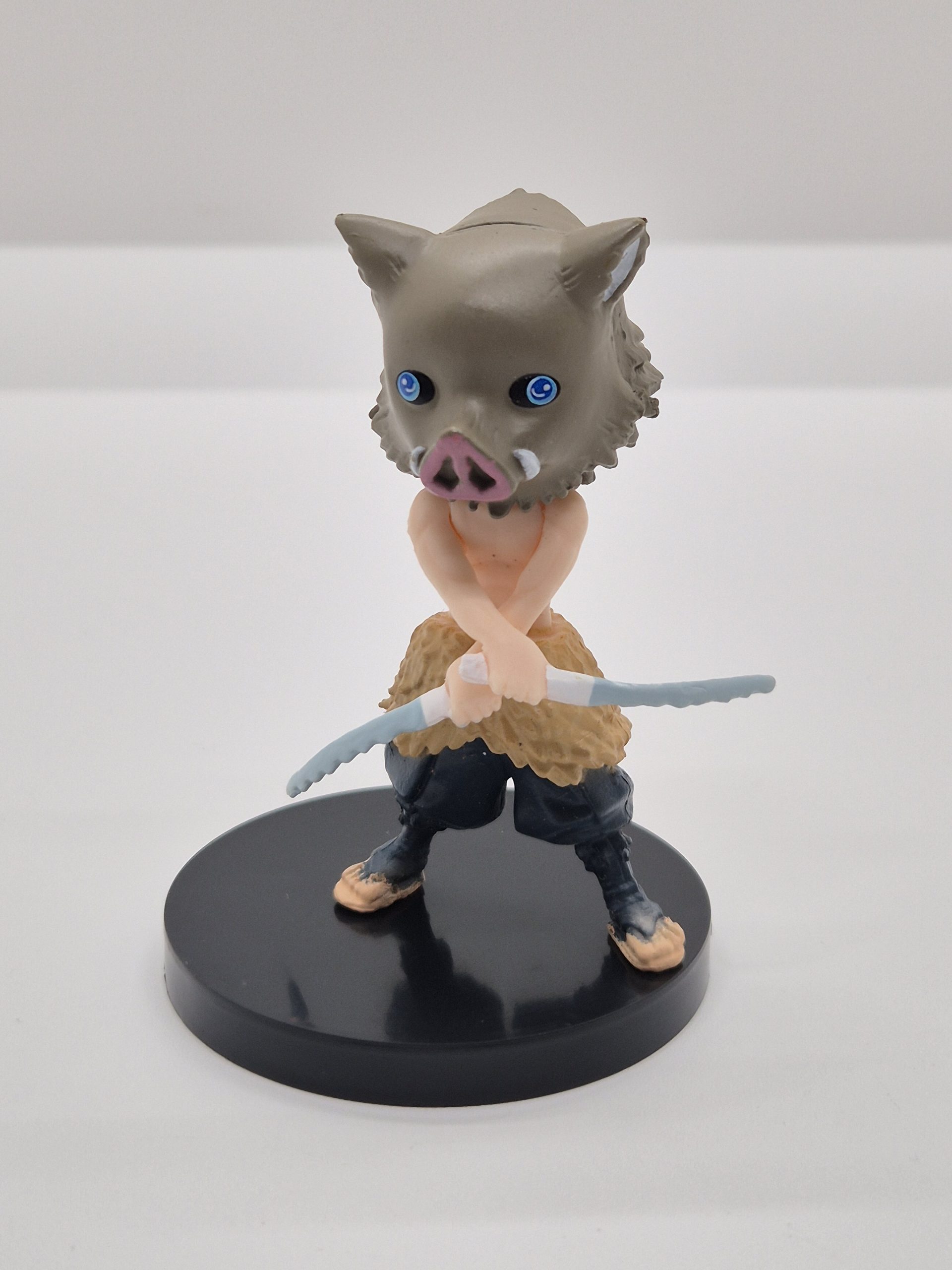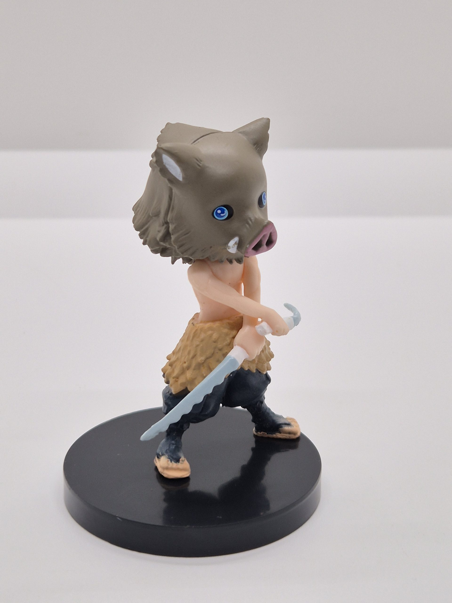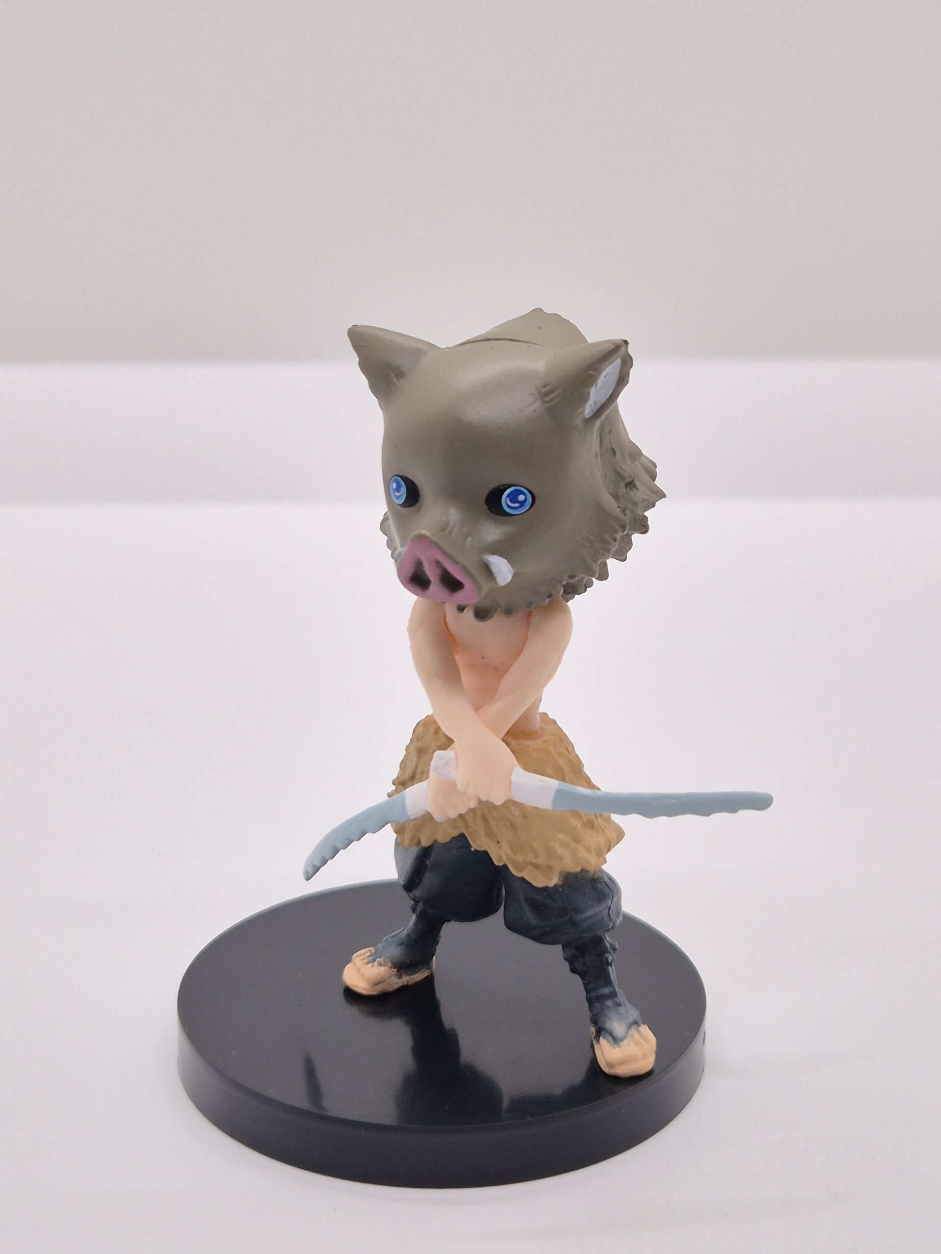 Il set non sarebbe completo senza Inosuke Hashibira, il combattente selvaggio con la testa di cinghiale. Inosuke è rappresentato con la sua caratteristica posa da battaglia, impugnando le sue due spade nichirin. La sua iconica testa di cinghiale è dettagliatissima, con la pelliccia scolpita fin nei minimi particolari, e i suoi muscoli ben definiti catturano alla perfezione la sua forza e aggressività.