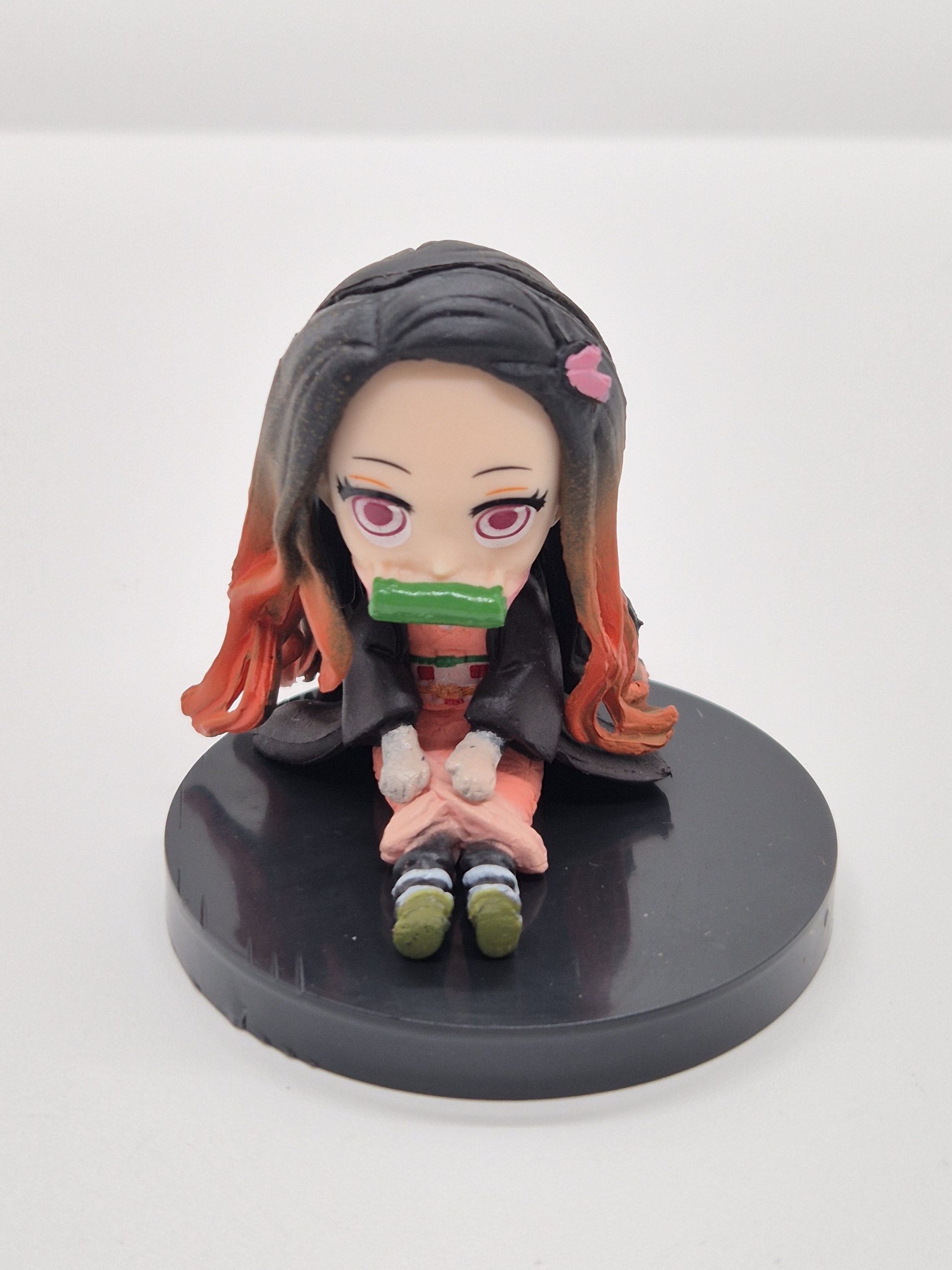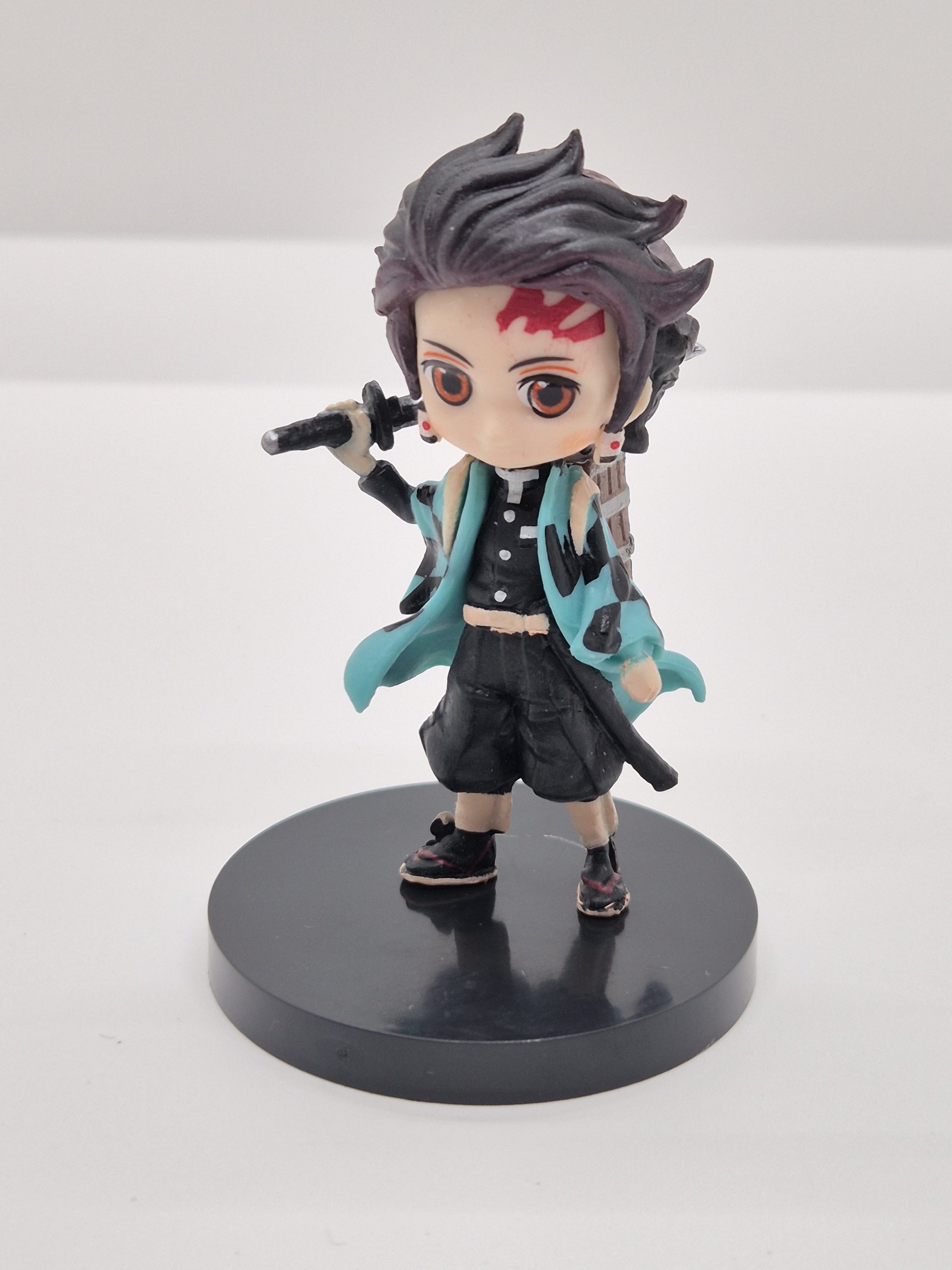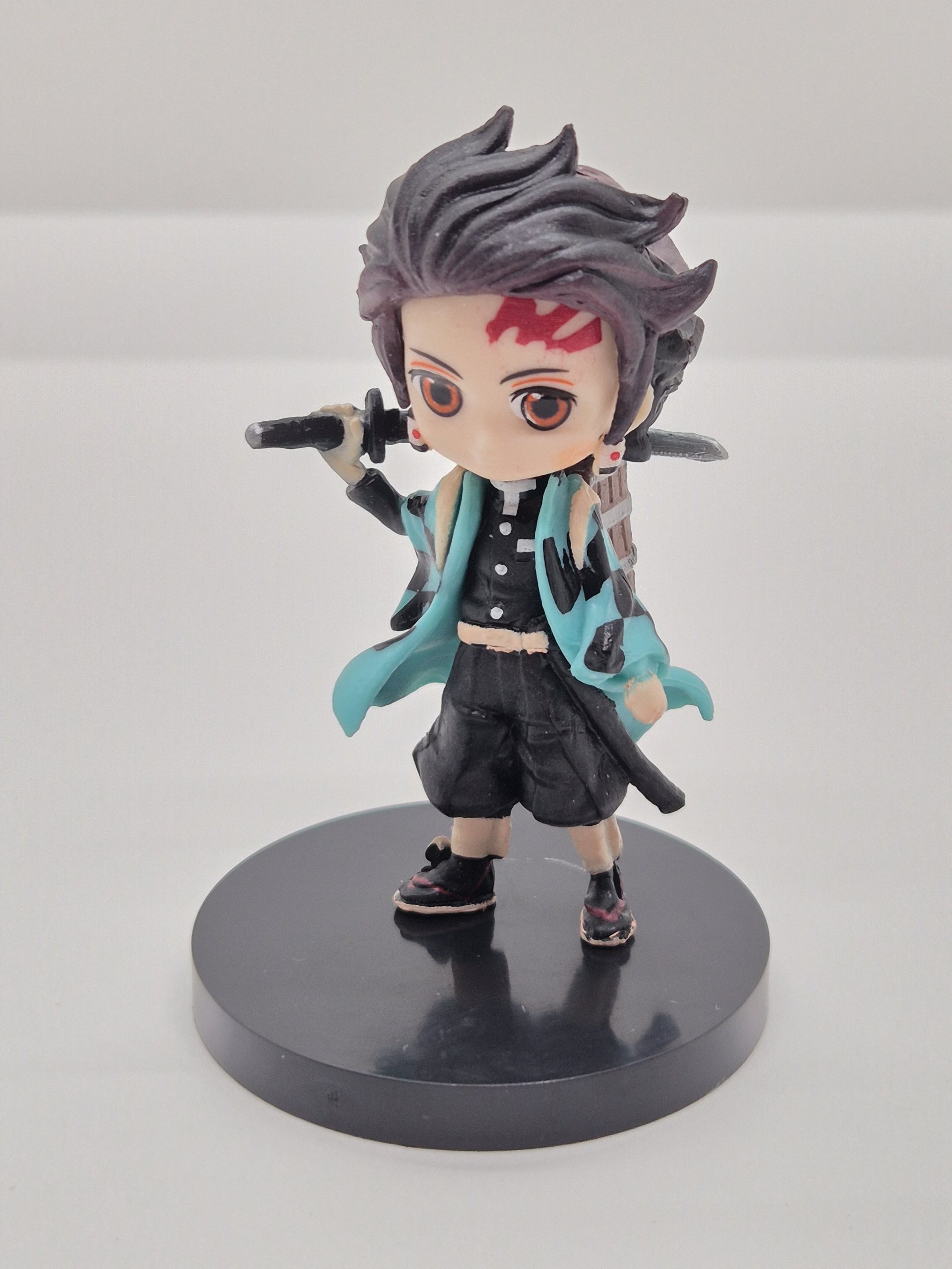 Tanjiro Kamado, il protagonista coraggioso e determinato, è rappresentato con il suo caratteristico haori a scacchi verdi e neri e la sua katana nichirin pronta all’azione. Il suo volto esprime la concentrazione e la determinazione che lo contraddistinguono mentre affronta le temibili minacce dei demoni. Nonostante le piccole dimensioni, i dettagli sono minuziosi, con attenzione posta anche alla sua iconica cicatrice sulla fronte.