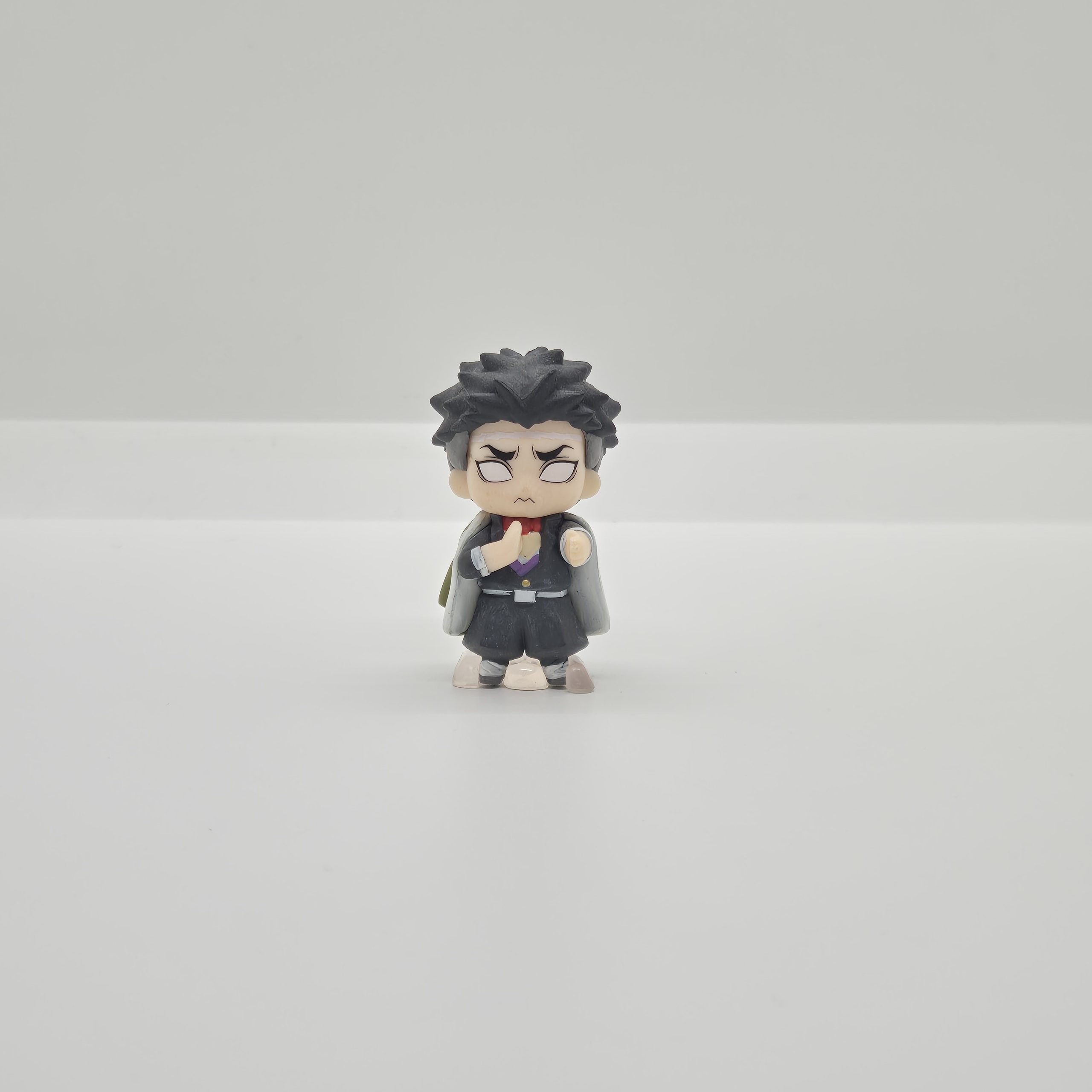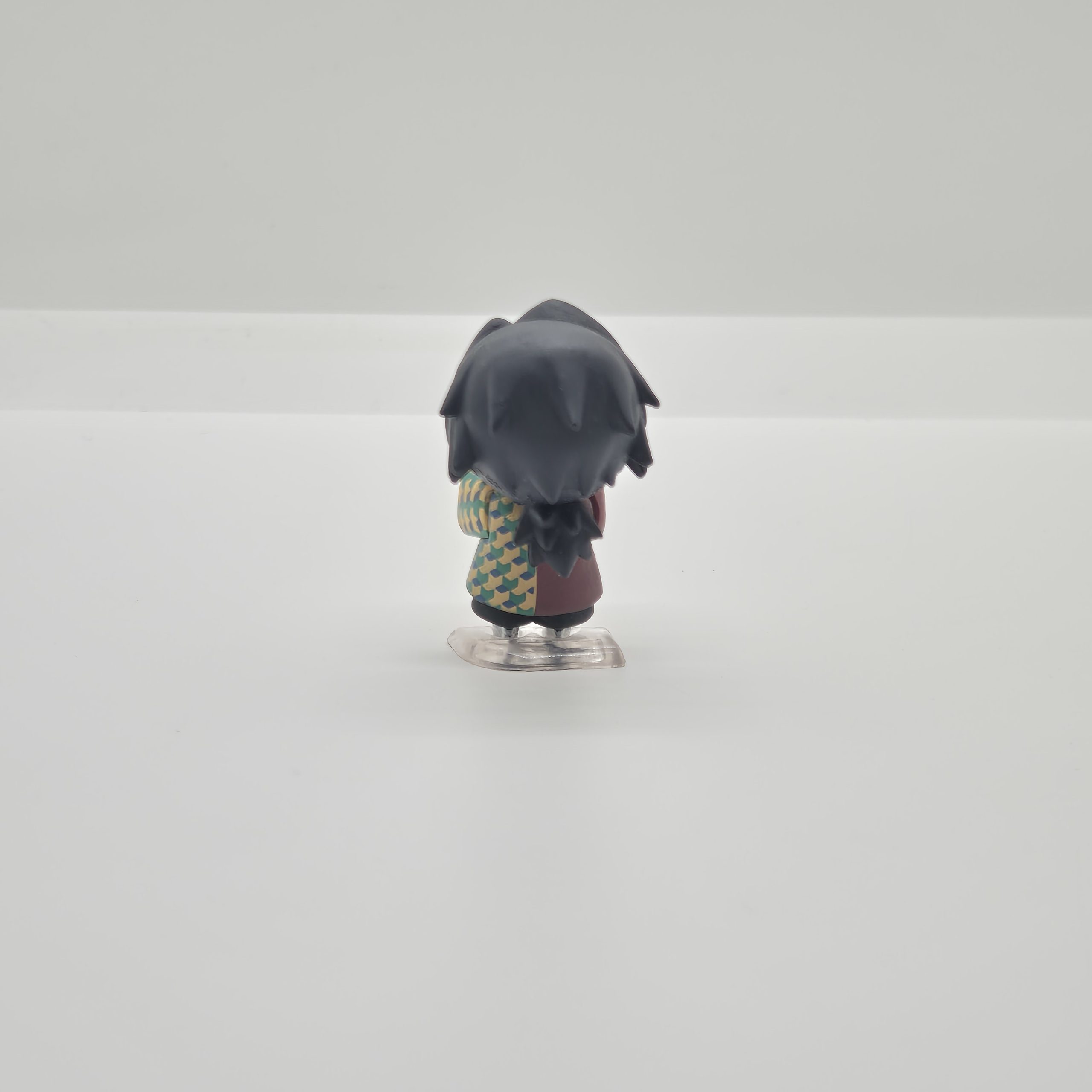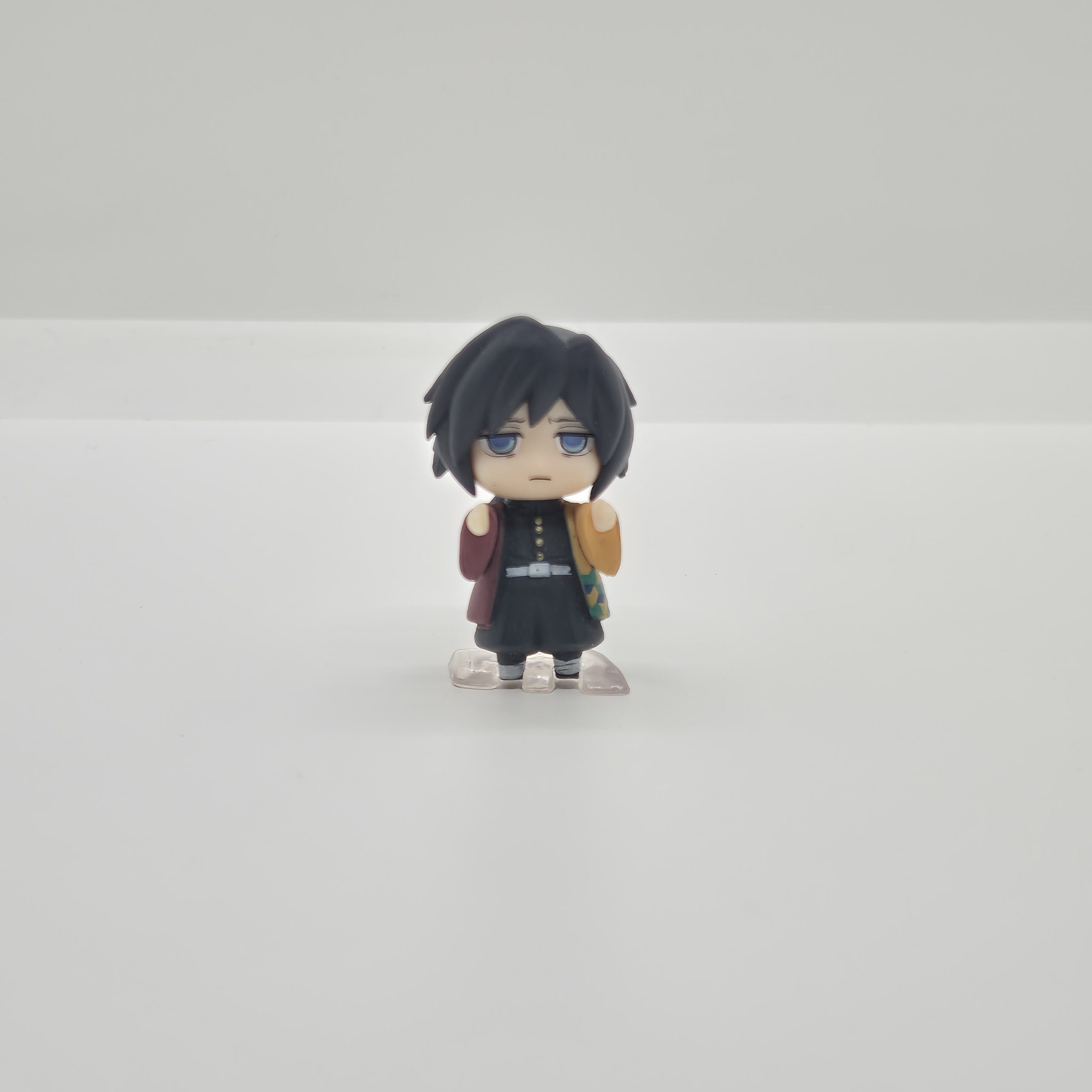 - Giyu Tomioka, il riservato Hashira dell’Acqua, è raffigurato con il suo atteggiamento calmo e il mantello bicolore, simbolo della sua forza e compostezza.
