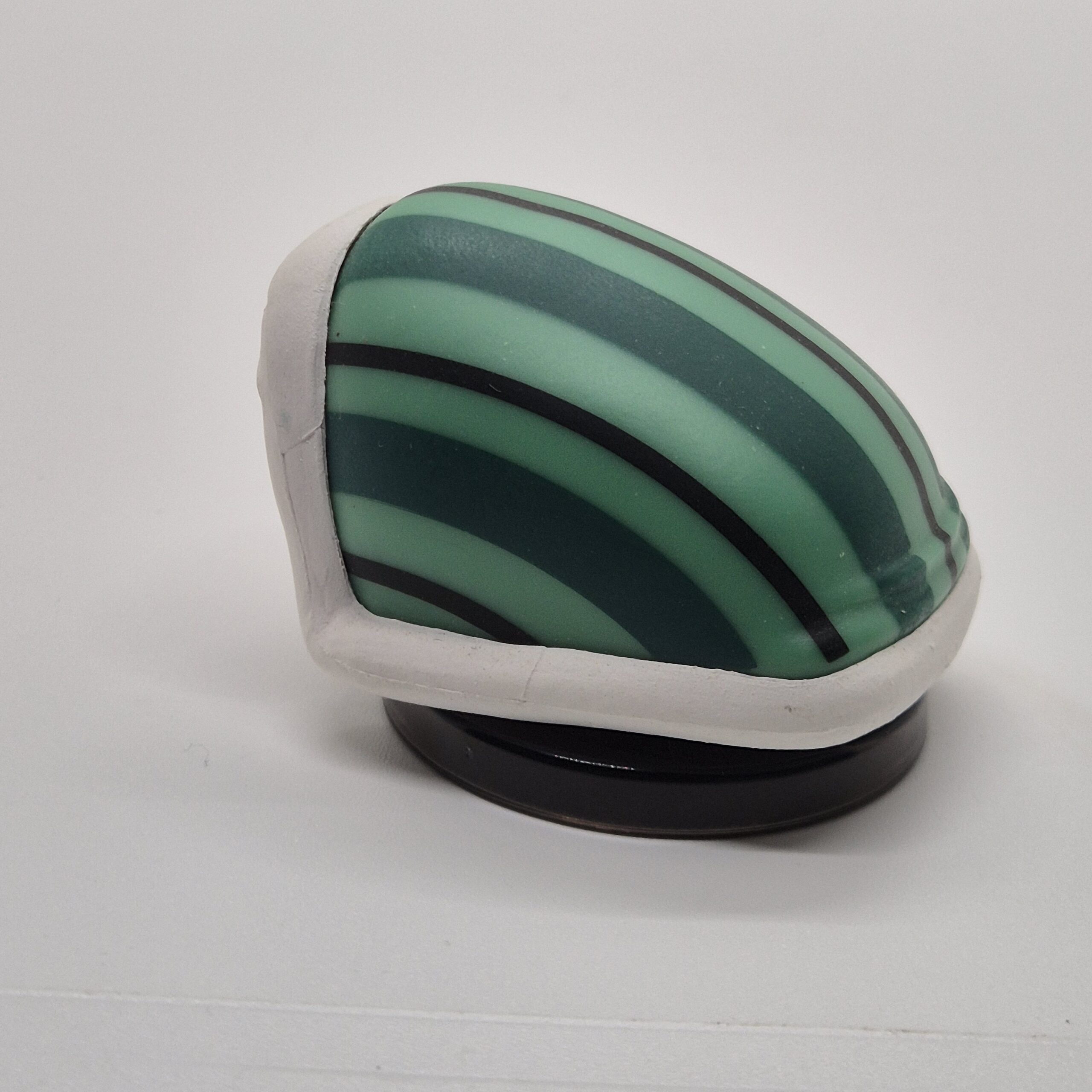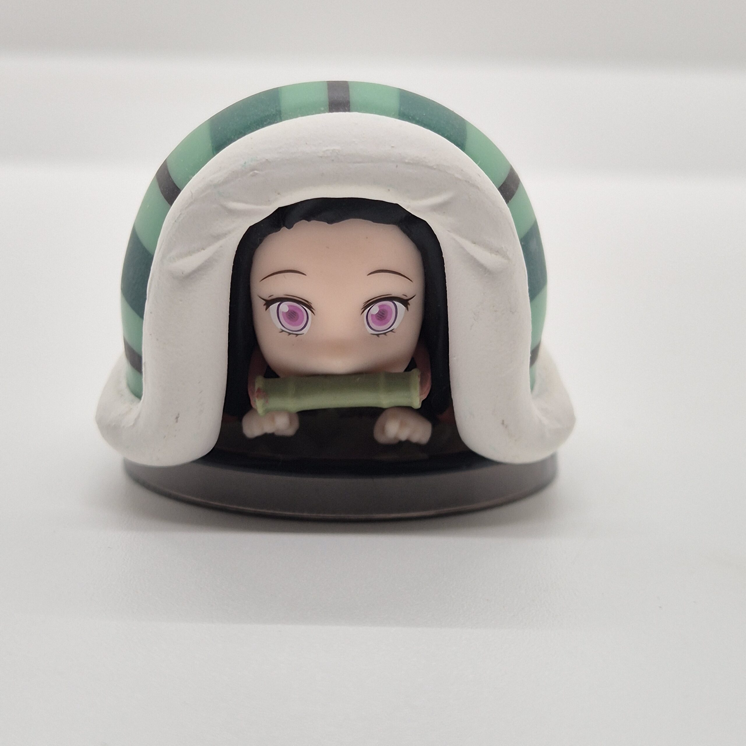 La figure ritrae Nezuko in una posa decisamente particolare e tenera: è rappresentata a carponi, mentre si trova sotto quella che appare come una coperta verde decorata con strisce di tonalità più chiare e più scure, sempre nella stessa gamma cromatica. Questa scelta scenica dona alla statuetta un’aria intima e quasi domestica, mettendo in risalto il lato più dolce e protettivo del personaggio.