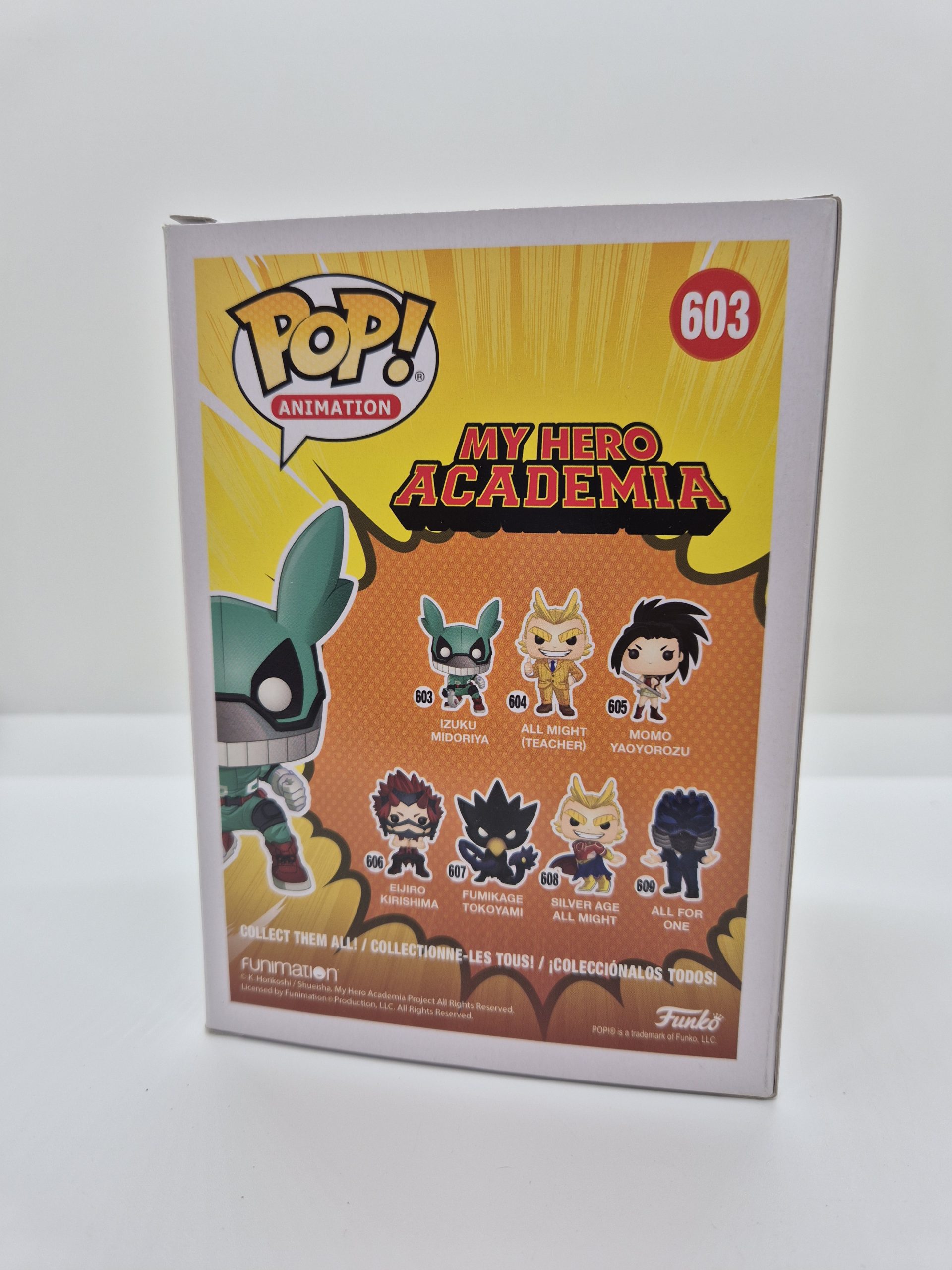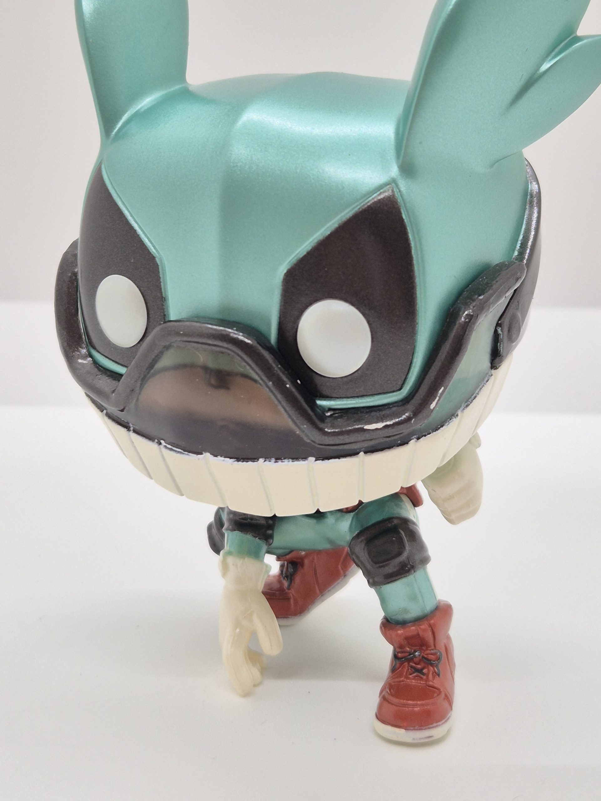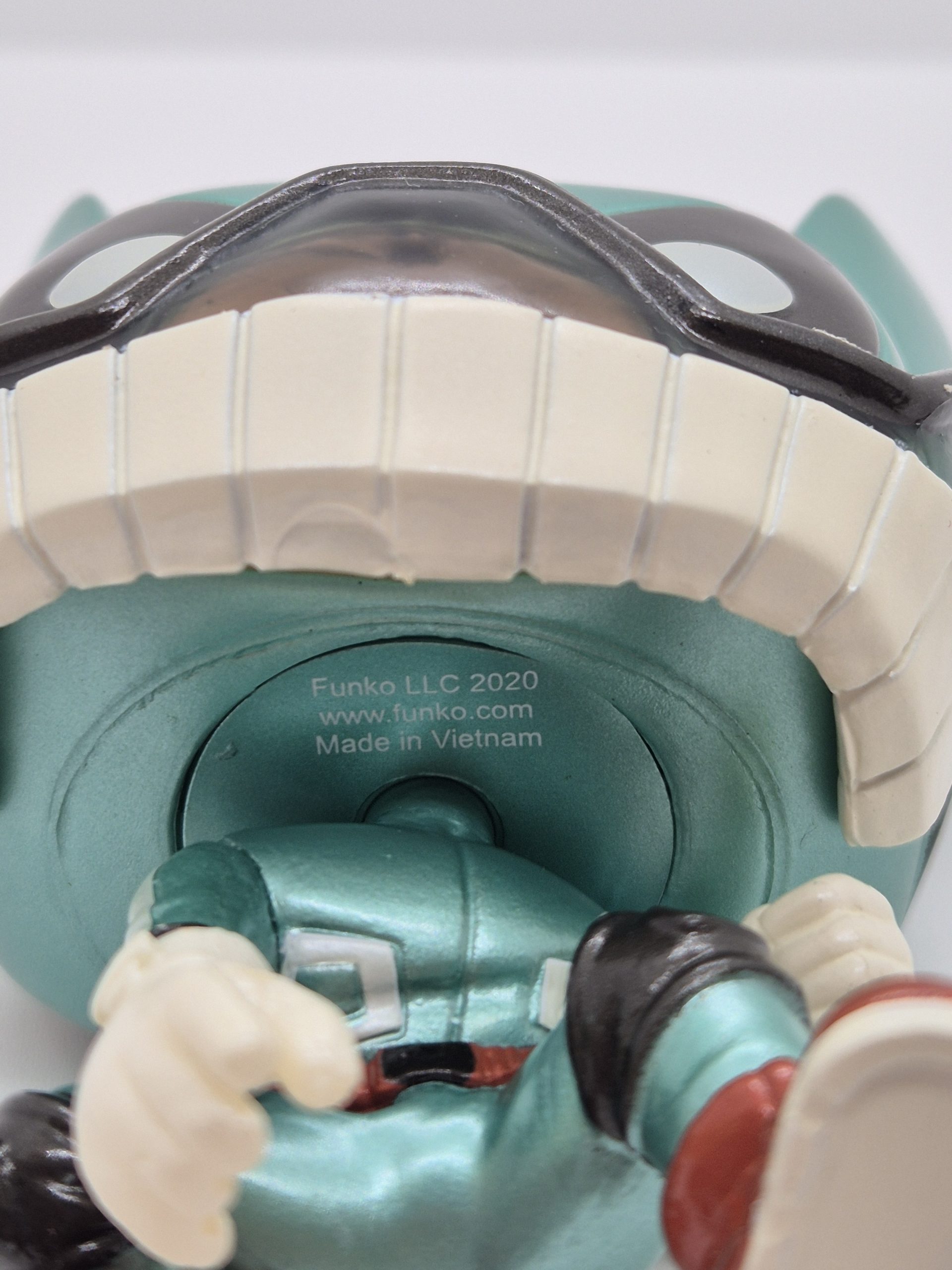 La figure mostra Izuku nel suo iconico costume da eroe, che ha evoluto nel corso della serie per adattarsi alla crescente padronanza del suo potere, il One For All. Il costume verde scuro con dettagli bianchi e neri è riprodotto con cura, compreso il copricapo che ricorda il sorriso del suo idolo, All Might, e le imbottiture protettive sui guanti e stivali. Sebbene lo stile Funko sia noto per le teste sovradimensionate e i tratti semplificati, questa versione di Midoriya riesce a mantenere l’energia e la determinazione che caratterizzano il personaggio.