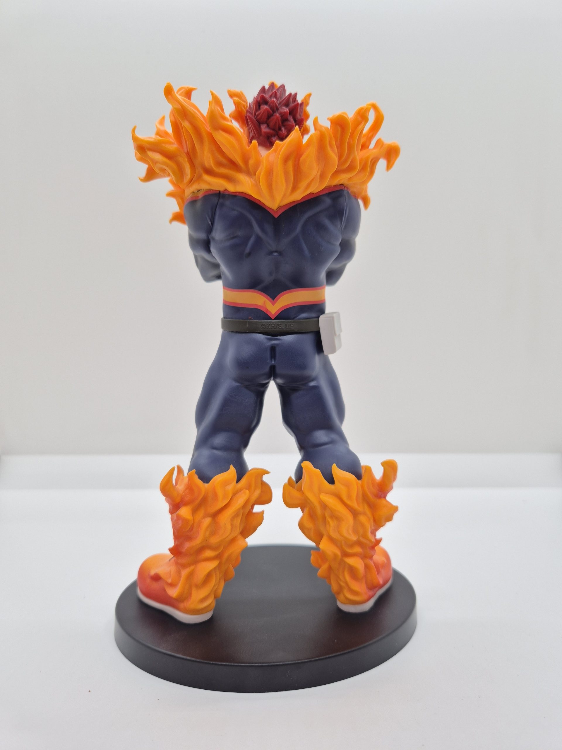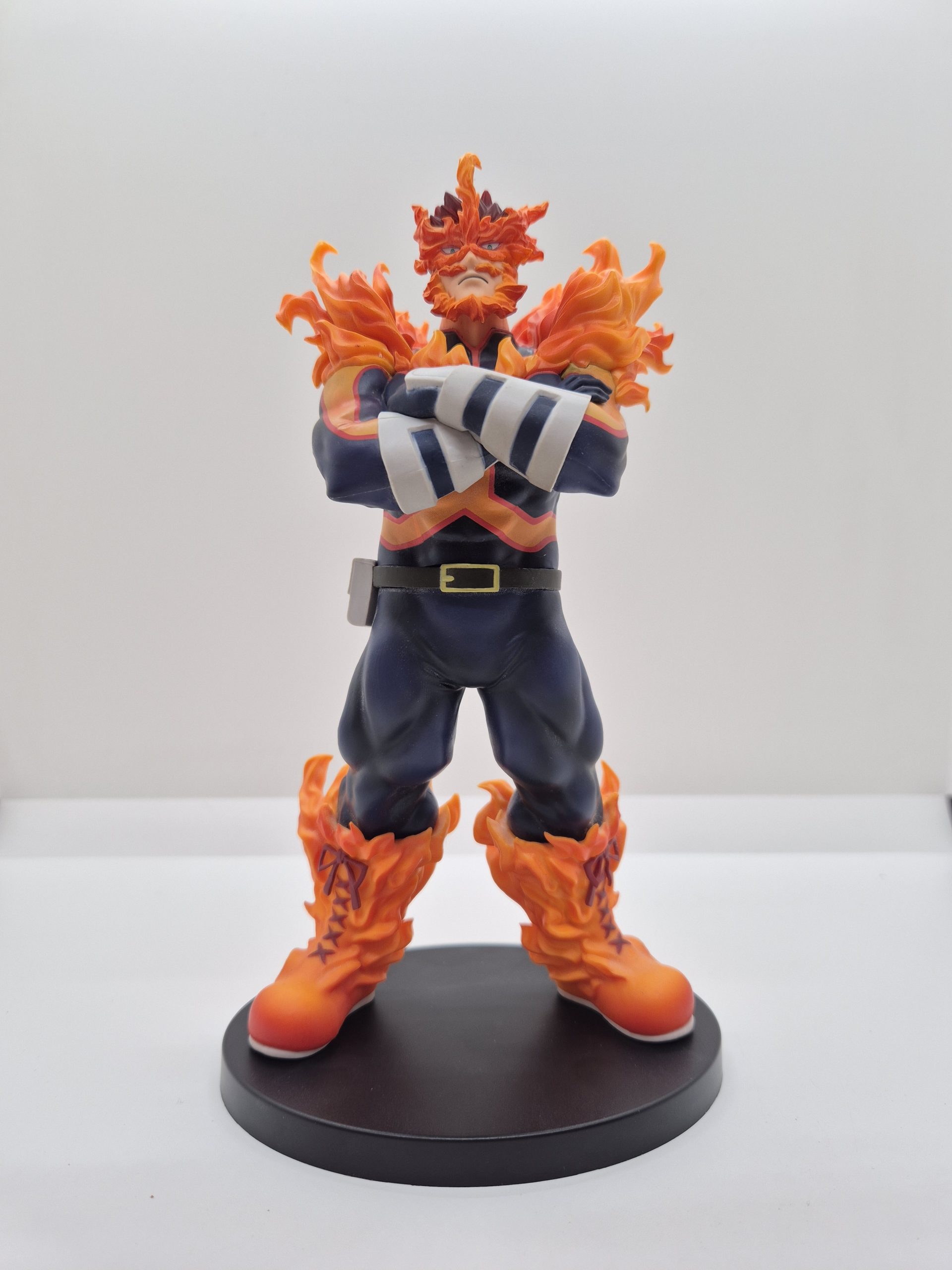 La figura di Endeavor trasuda potenza e determinazione. La posa è forte e autoritaria, con il personaggio che si prepara all’azione, pronto a usare la sua forza incandescente per affrontare i nemici. I dettagli nelle fiamme che avvolgono le sue braccia e gambe, insieme alla sua espressione intensa, catturano perfettamente l’essenza del suo personaggio, costantemente alla ricerca della perfezione e del riconoscimento come il più grande eroe. Il mantello di fuoco che si solleva dietro di lui dà alla figura una sensazione di movimento, come se stesse per scatenare tutta la potenza del suo Quirk in un attacco devastante.