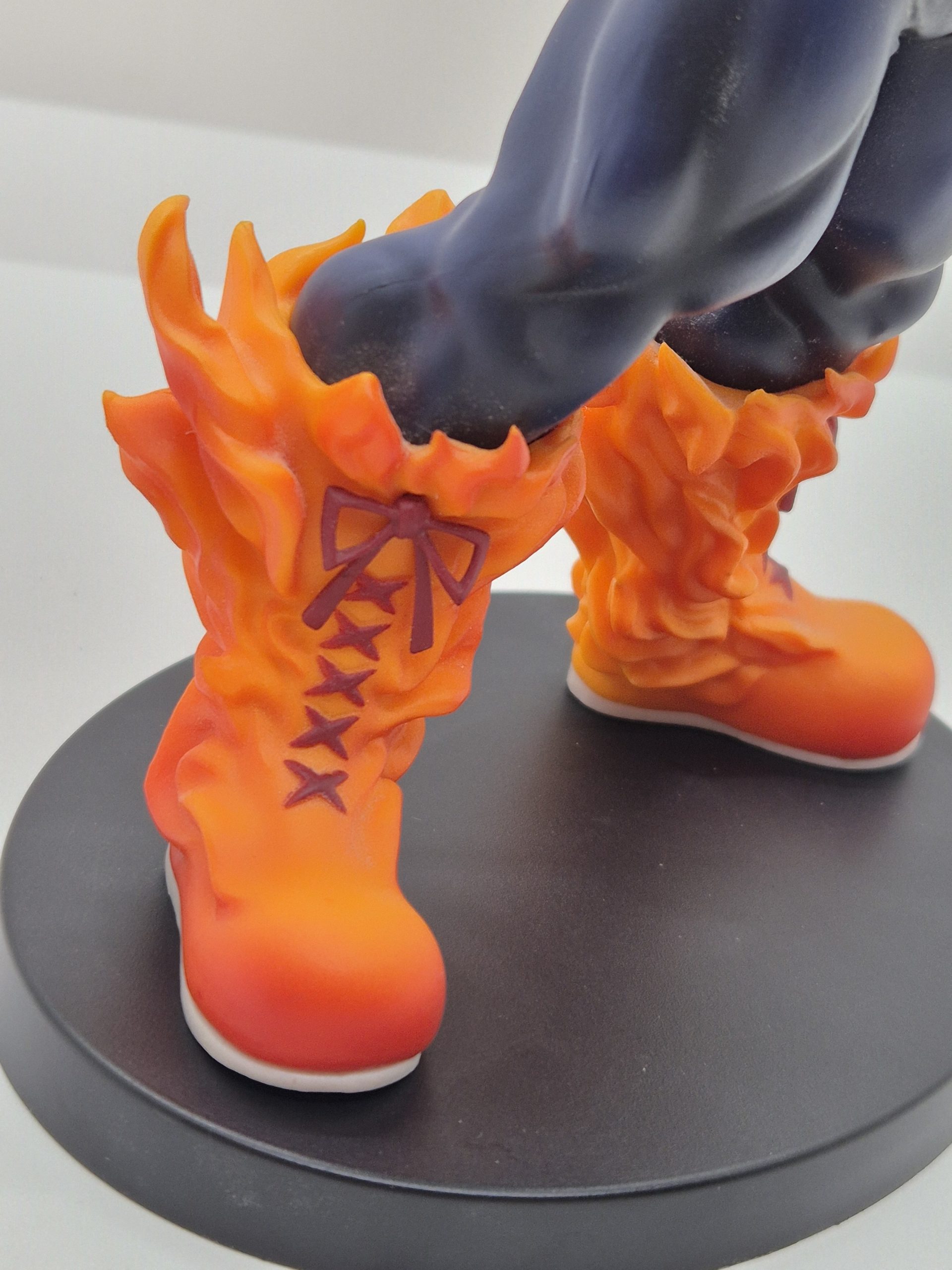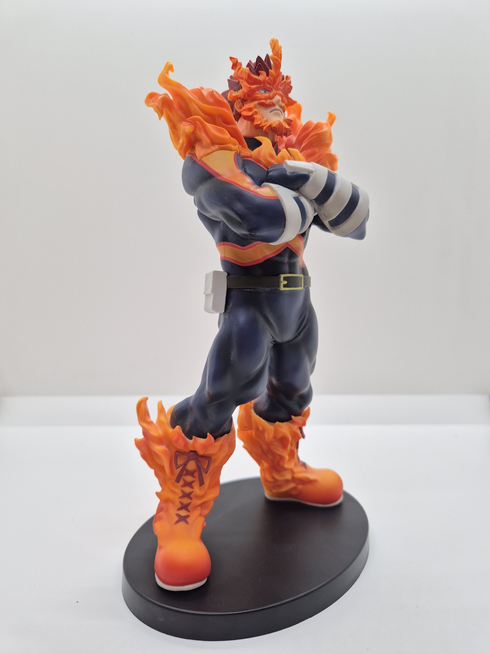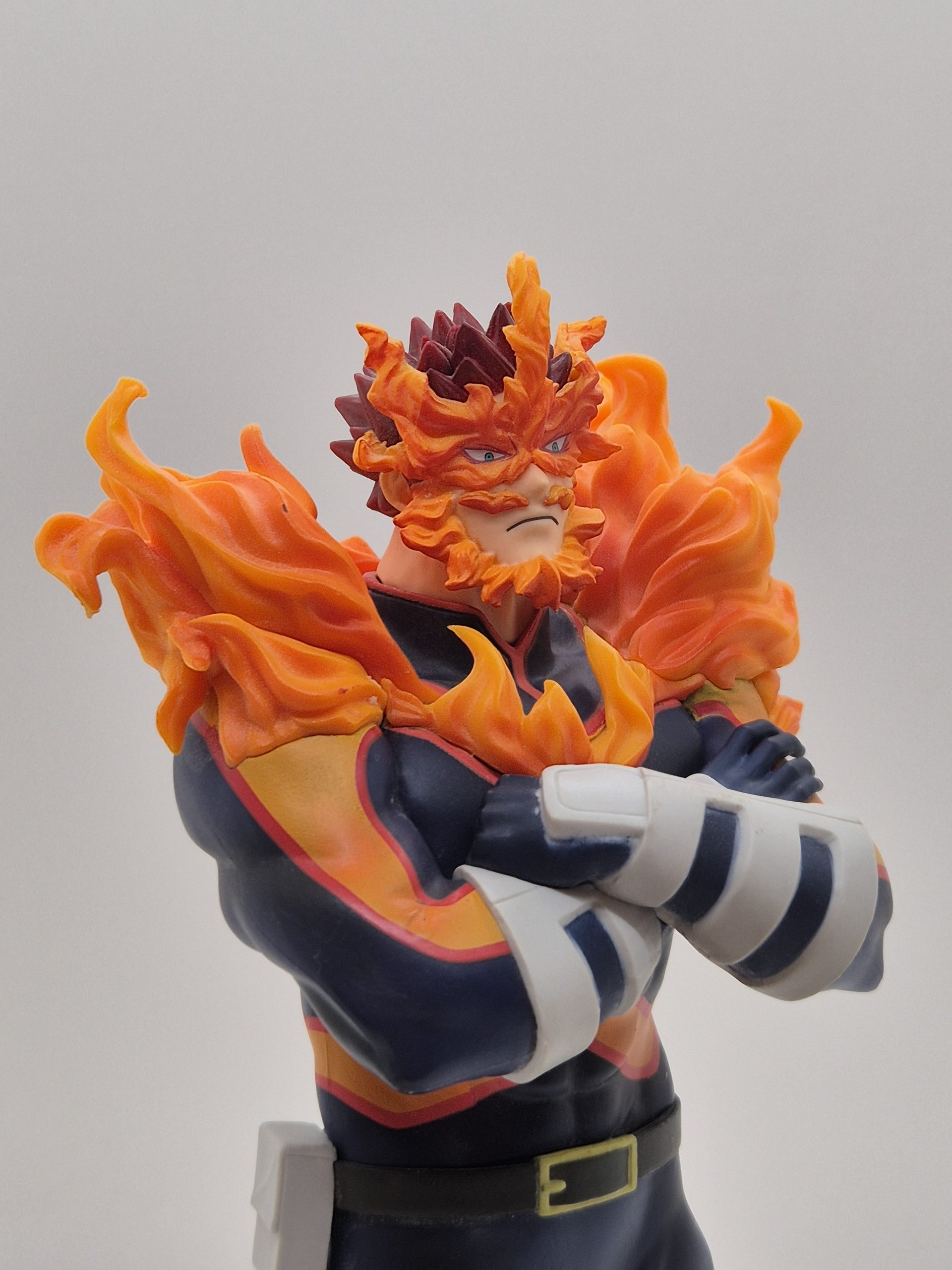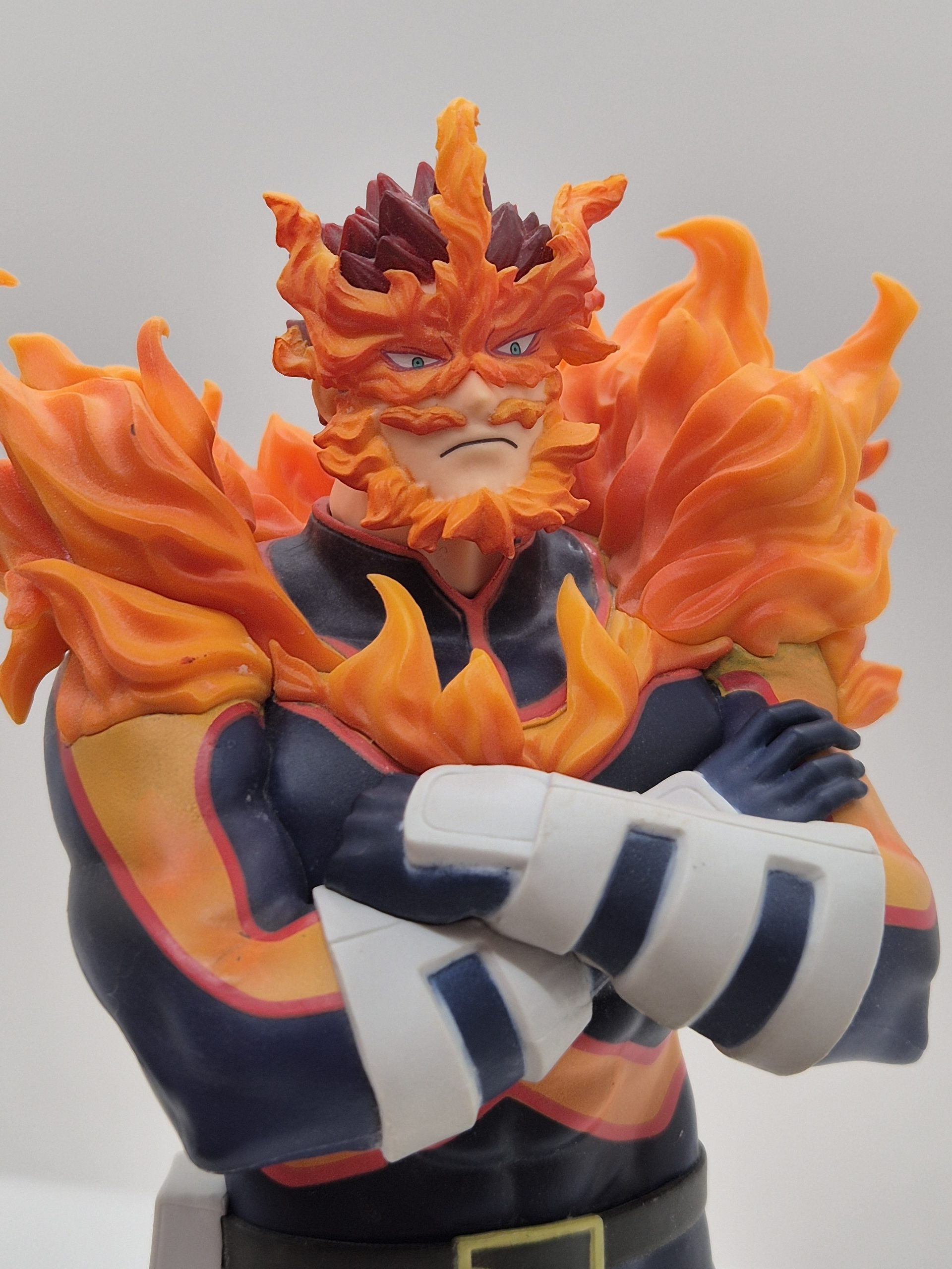 Endeavor è conosciuto per il suo Quirk, chiamato Hellflame, che gli permette di manipolare e controllare fiamme a volontà. La figura di Endeavor è scolpita in una posa dinamica, con il suo corpo imponente circondato da fiamme ardenti che emanano dalla sua tuta da eroe, una caratteristica distintiva del suo potere. Il costume è riprodotto nei suoi classici colori blu, arancione e rosso, con dettagli meticolosi che evidenziano la struttura muscolare di Endeavor, il tutto arricchito dall’iconico “mustache” di fuoco che avvolge il suo volto e le spalle.
