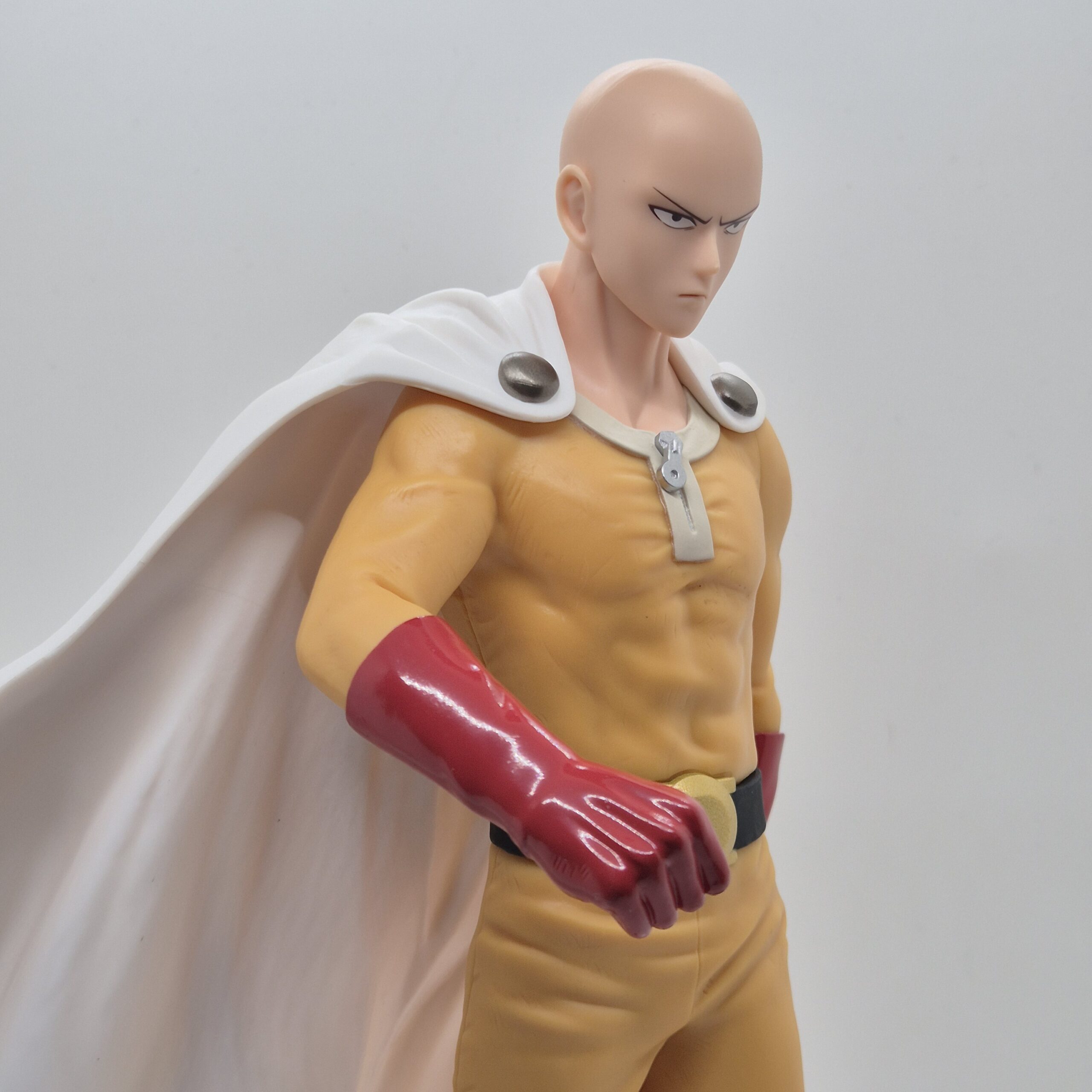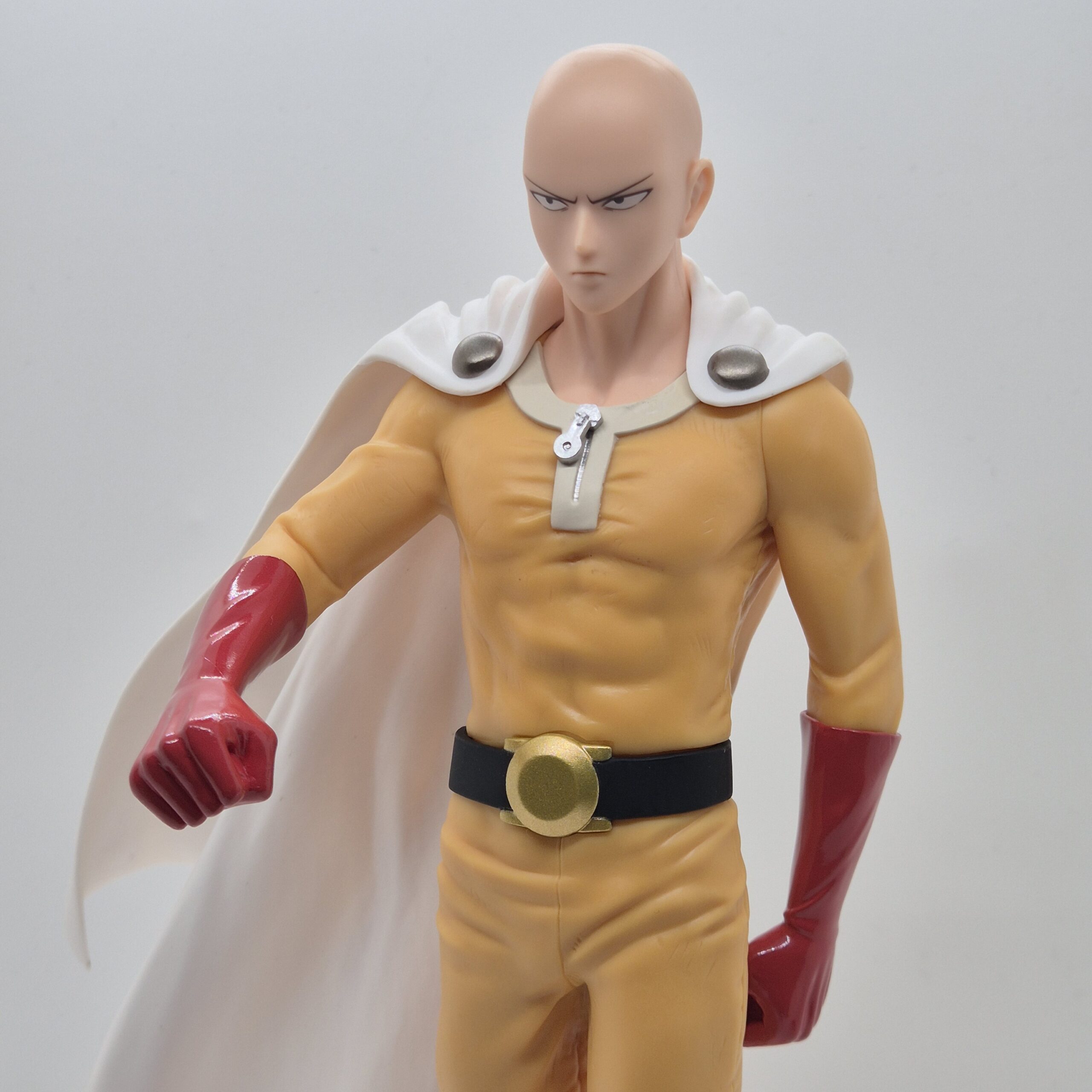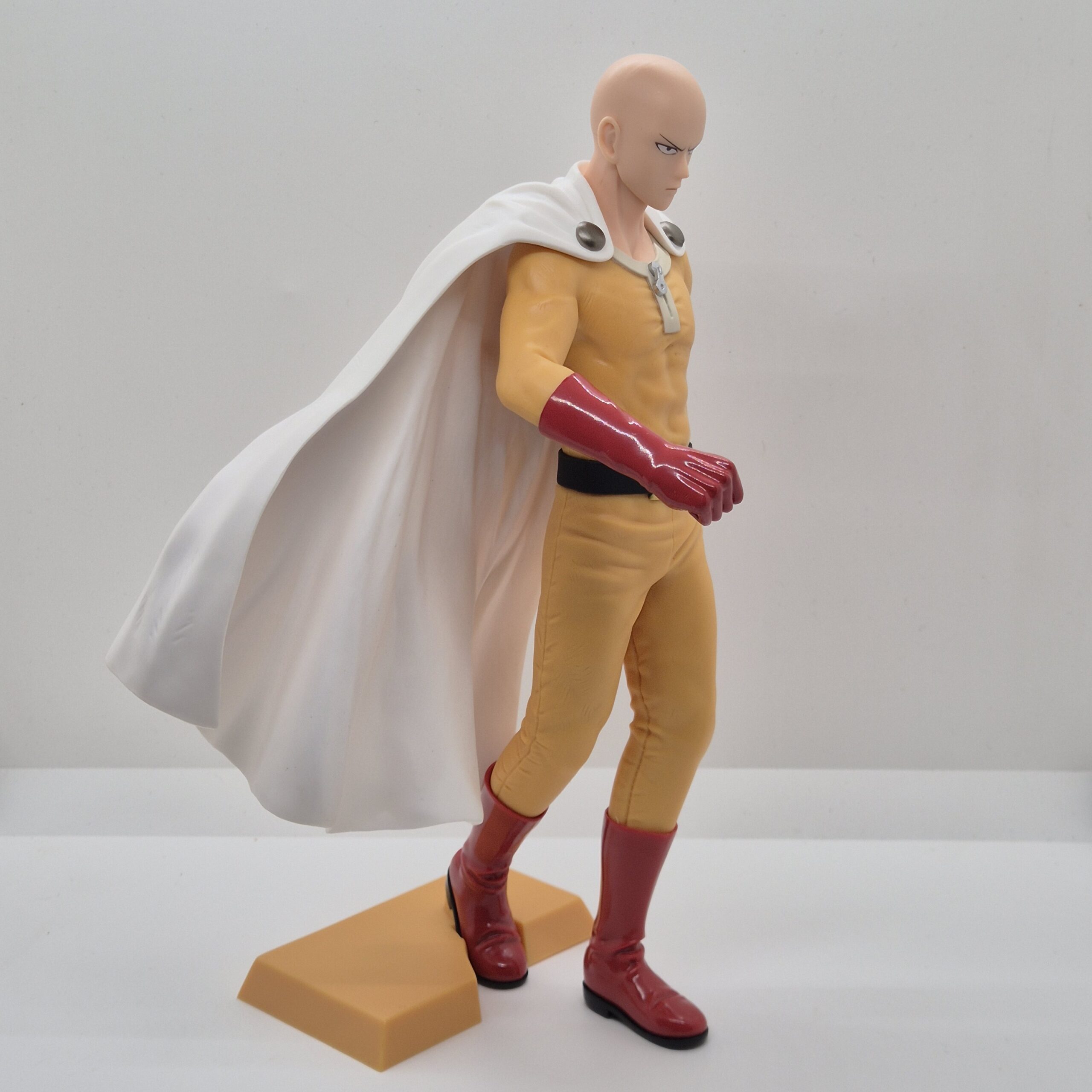 La scultura raffigura Saitama nel suo classico outfit da eroe: tuta gialla, guanti rossi, stivali e il caratteristico mantello bianco. La posa è semplice e composta, ma proprio per questo estremamente coerente con il personaggio. Non c’è bisogno di effetti dinamici o movimenti esagerati: la forza di Saitama sta nella sua calma assoluta, e la figure riesce a trasmettere perfettamente questa sensazione di potenza trattenuta.