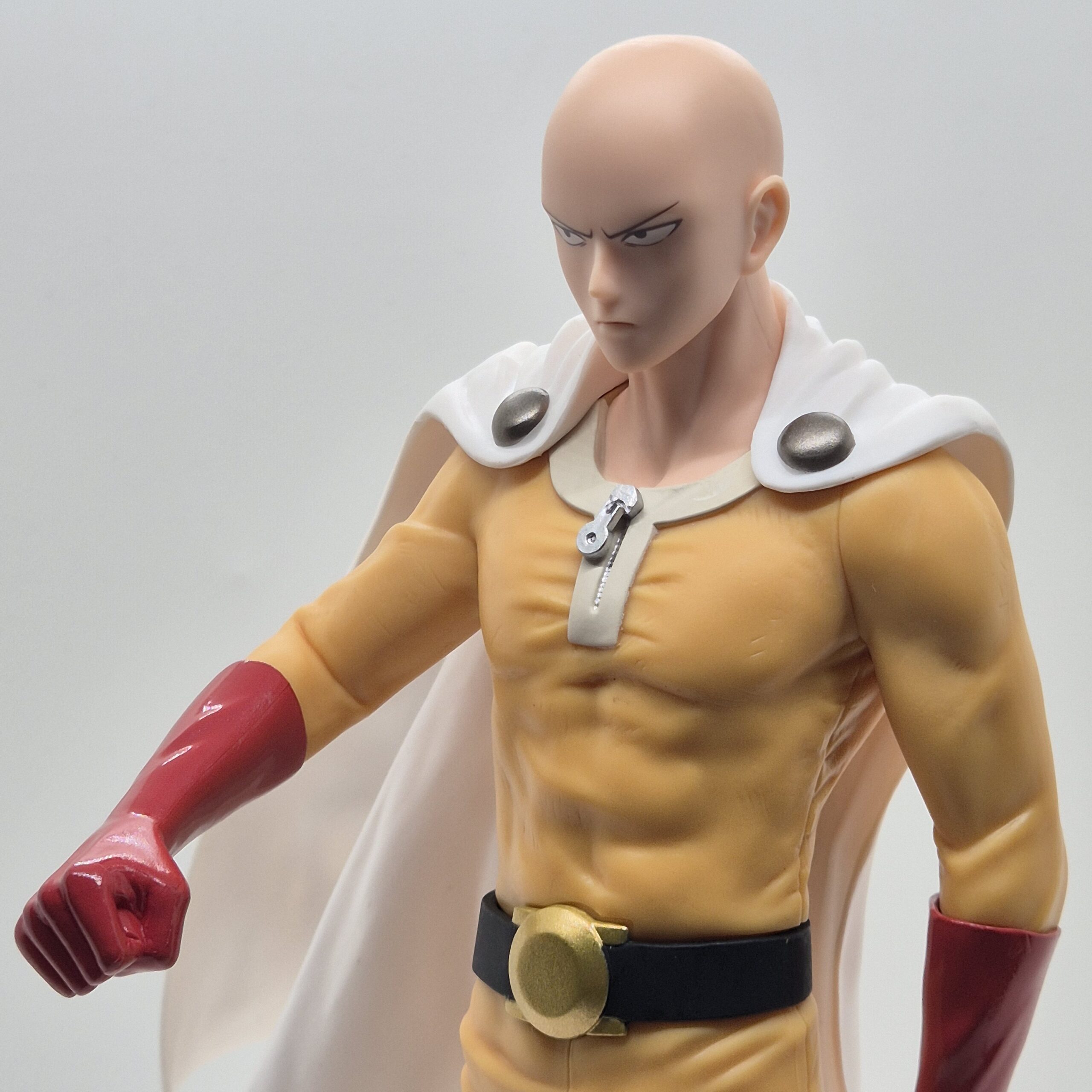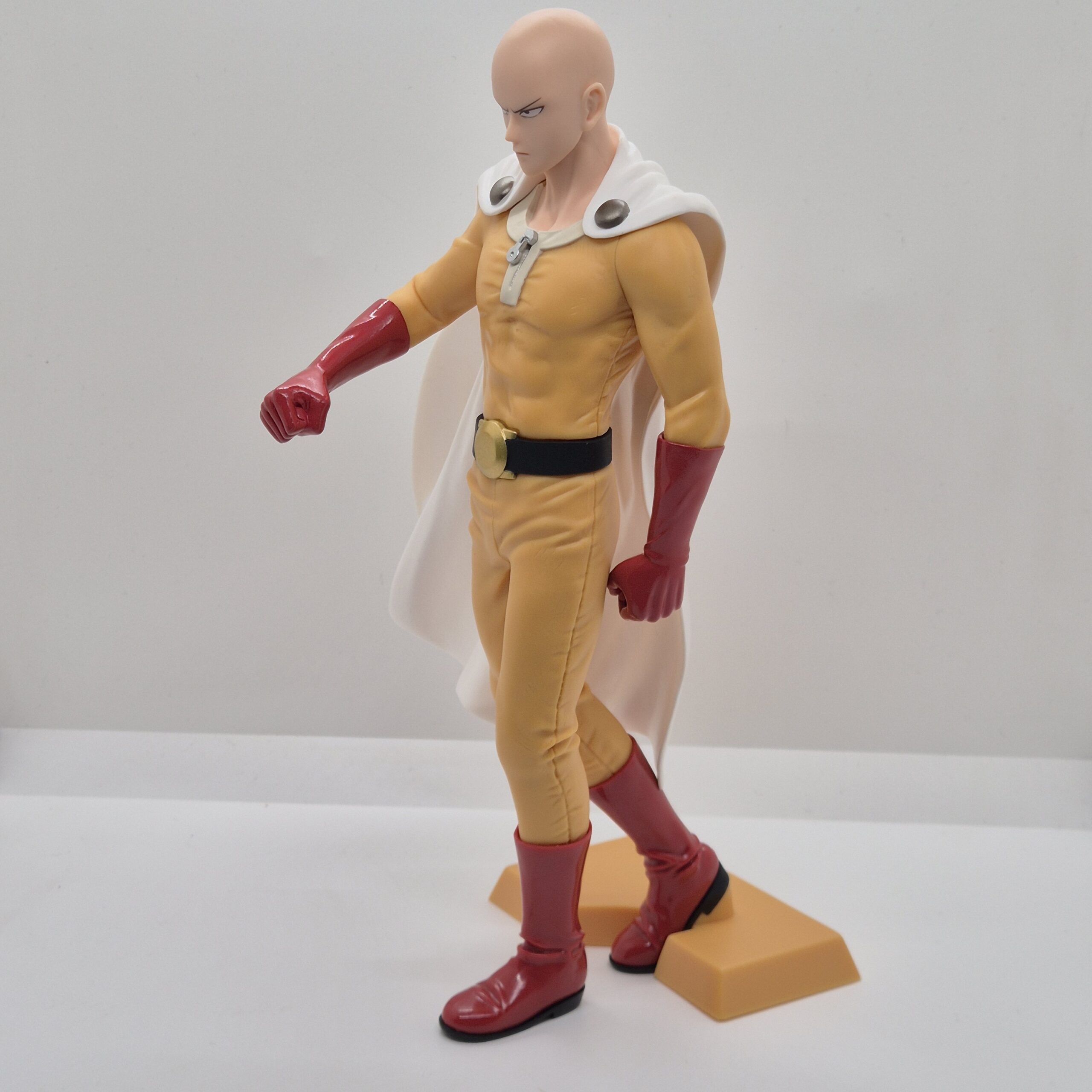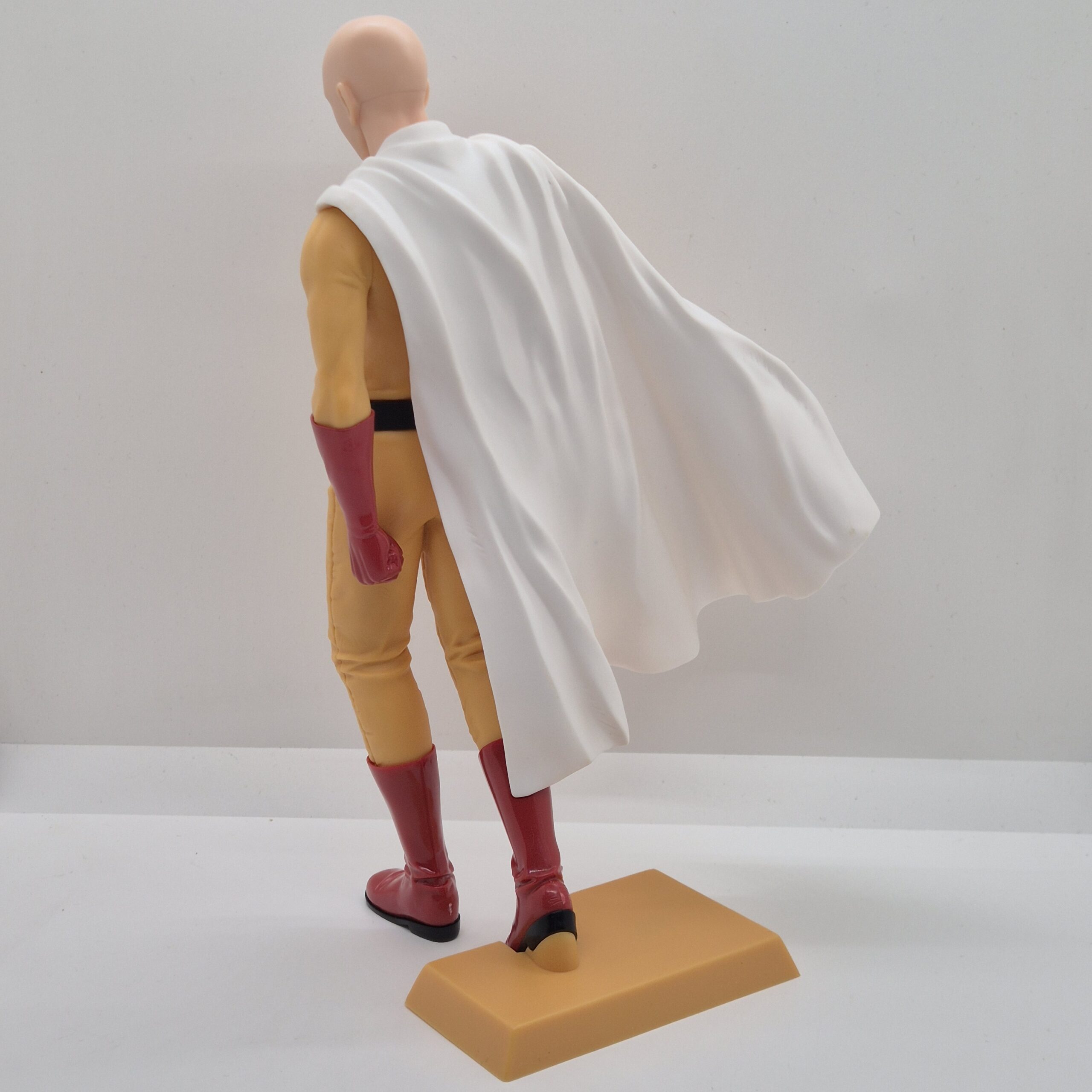 La scultura raffigura Saitama nel suo classico outfit da eroe: tuta gialla, guanti rossi, stivali e il caratteristico mantello bianco. La posa è semplice e composta, ma proprio per questo estremamente coerente con il personaggio. Non c’è bisogno di effetti dinamici o movimenti esagerati: la forza di Saitama sta nella sua calma assoluta, e la figure riesce a trasmettere perfettamente questa sensazione di potenza trattenuta.