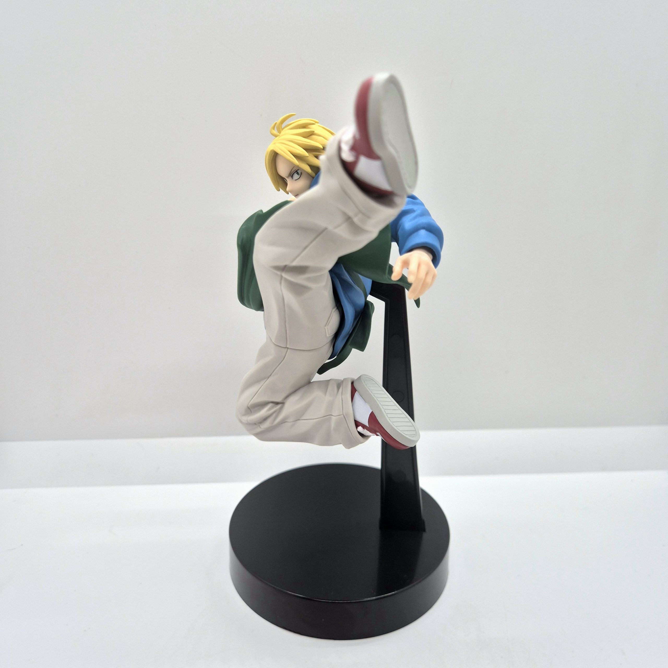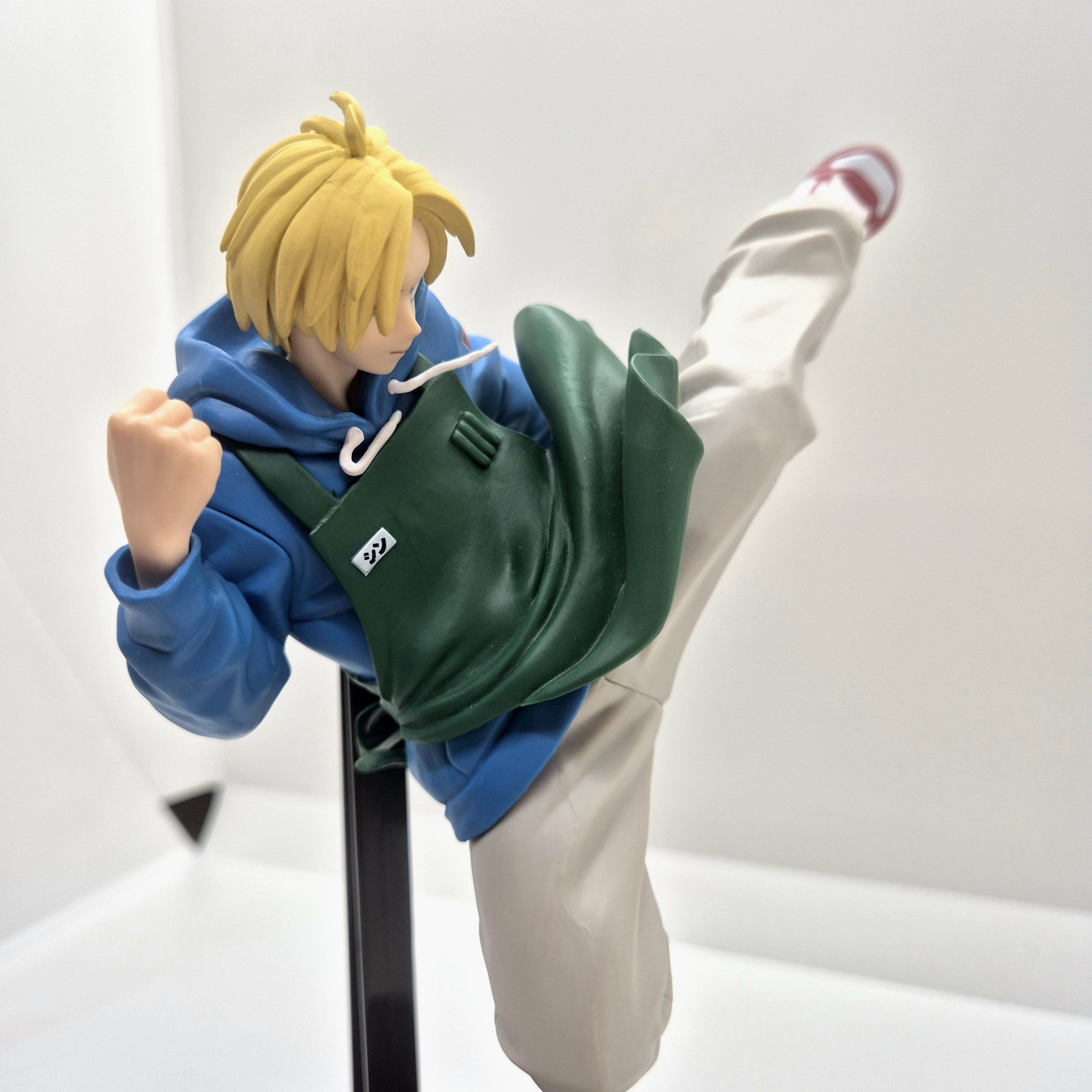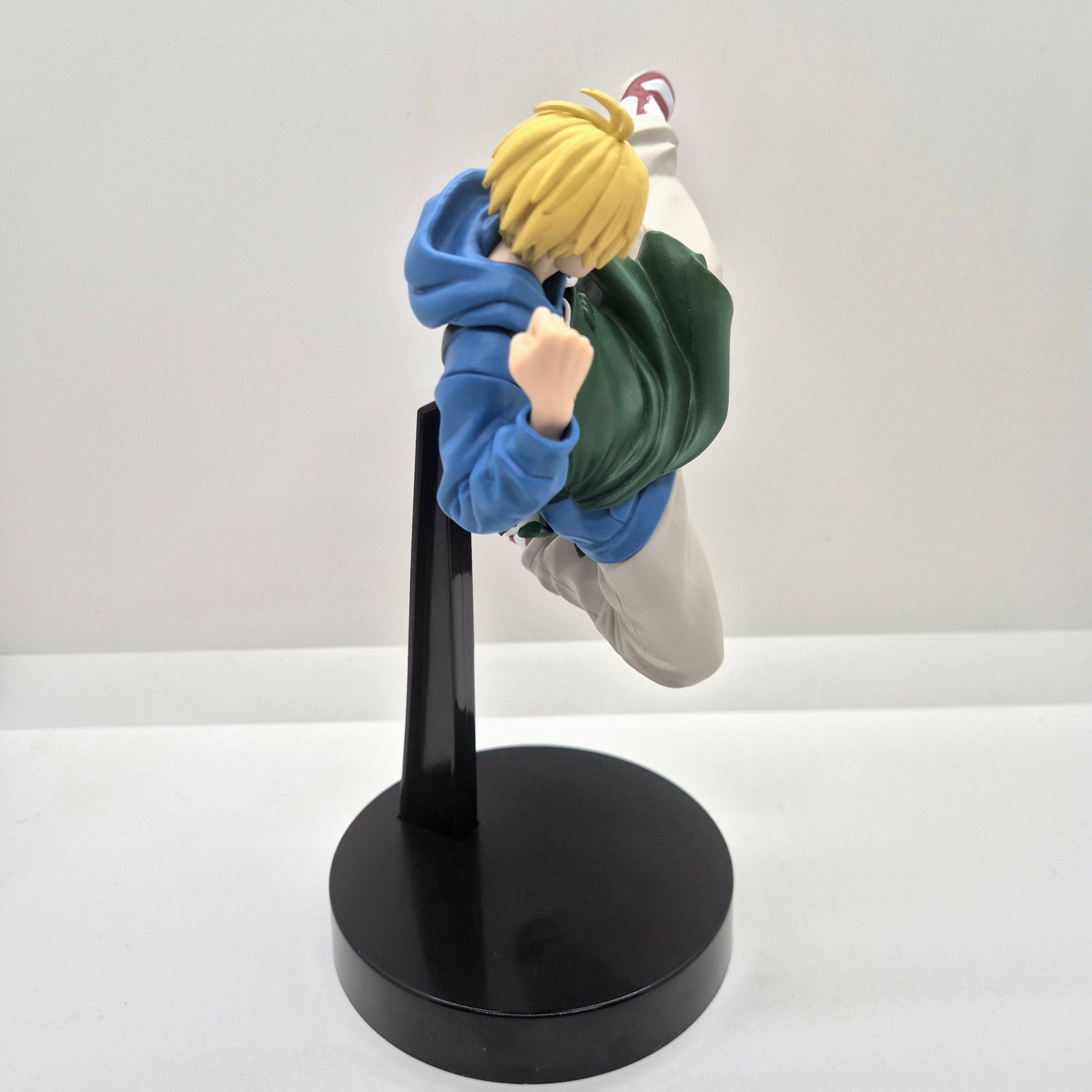 Il volto serio e concentrato di Shin riflette la determinazione tipica del personaggio, e l’ottima lavorazione del viso e dei capelli aggiunge profondità alla scultura. La base di supporto, di colore nero, sostiene con eleganza la posa a mezz’aria, dando solidità alla figura senza distogliere l’attenzione dal dinamismo della scena. Le pieghe dei vestiti e l’effetto movimento del corpo sono resi con cura, donando realismo e fluidità alla composizione. Alta circa 14 cm, questa figure è un vero omaggio all’agilità e al coraggio