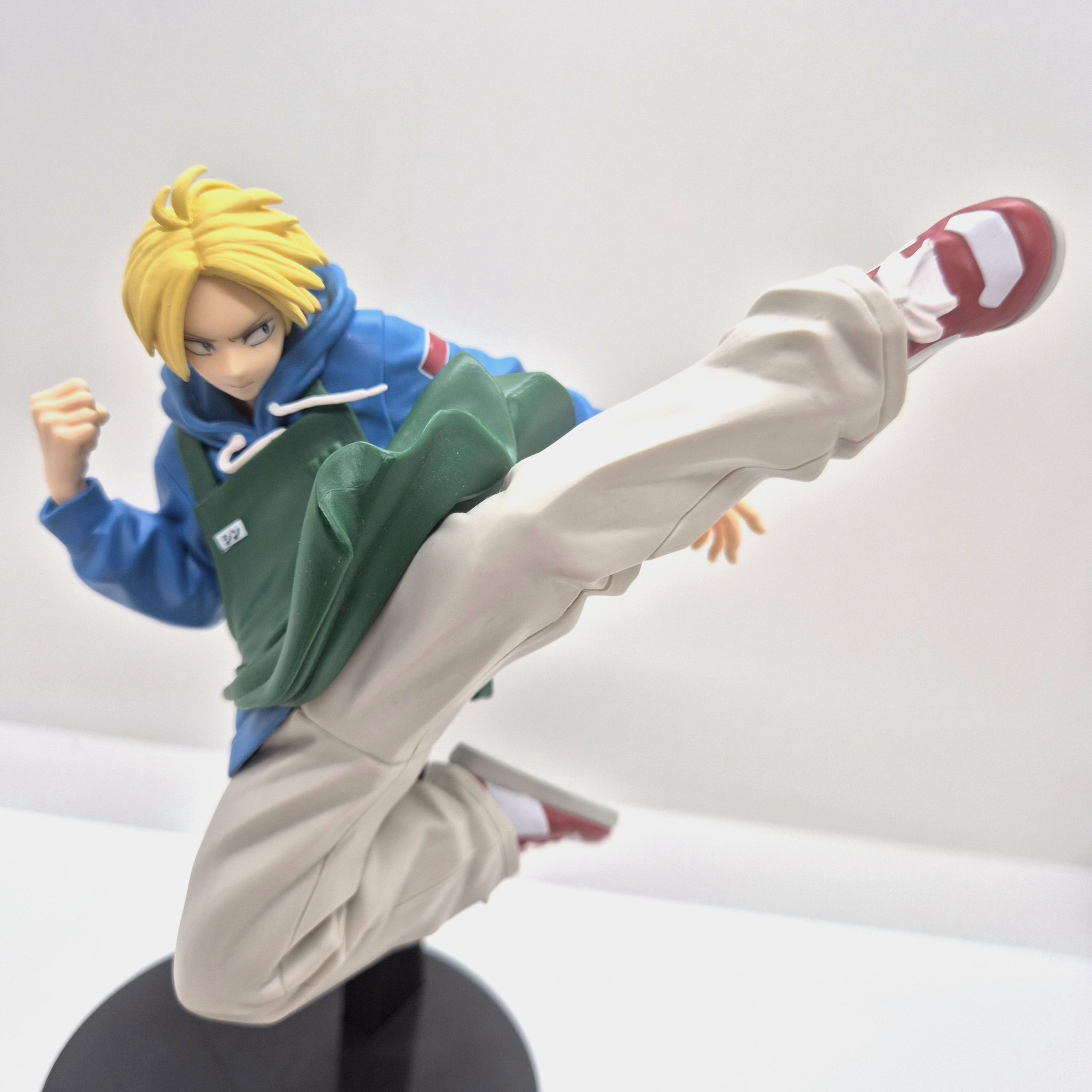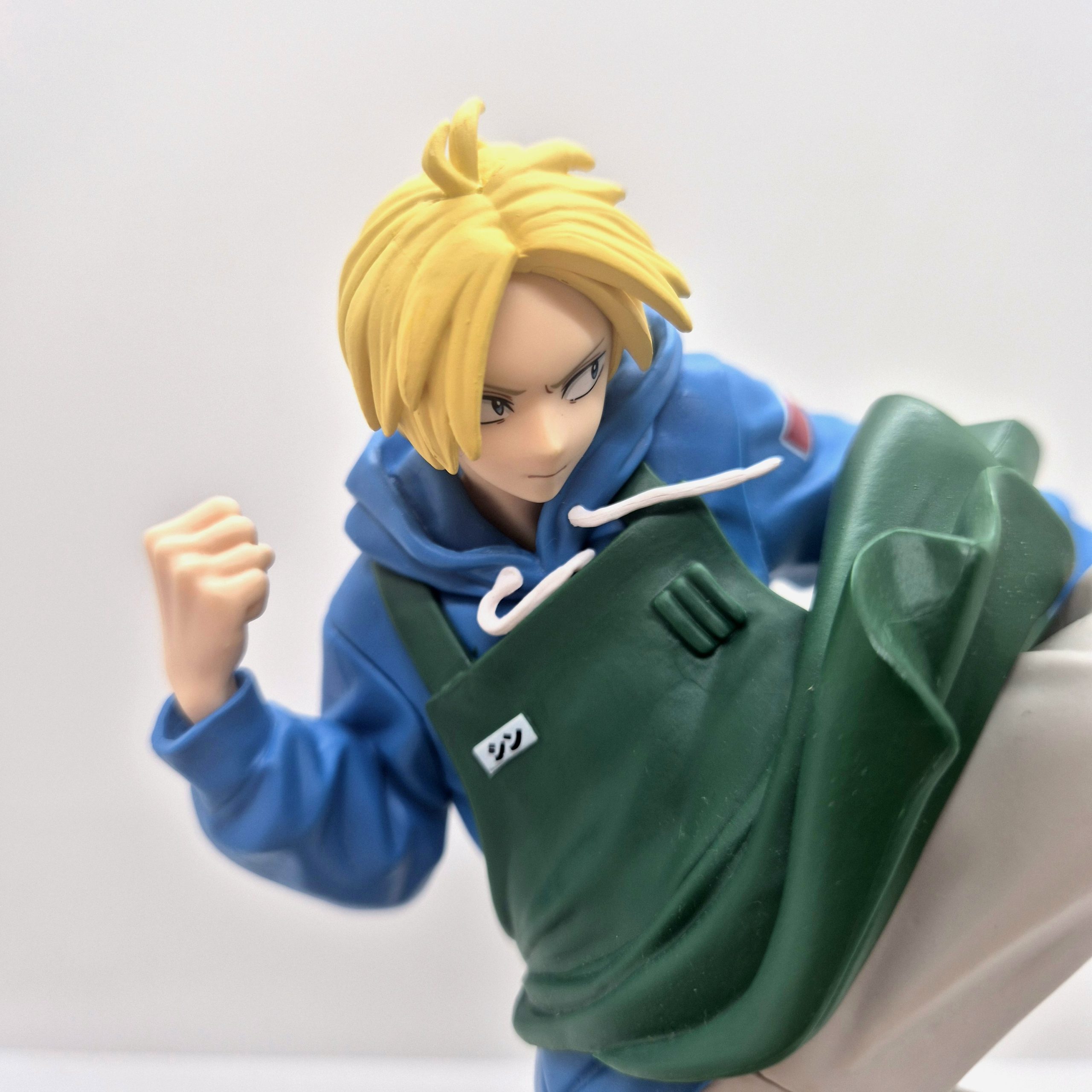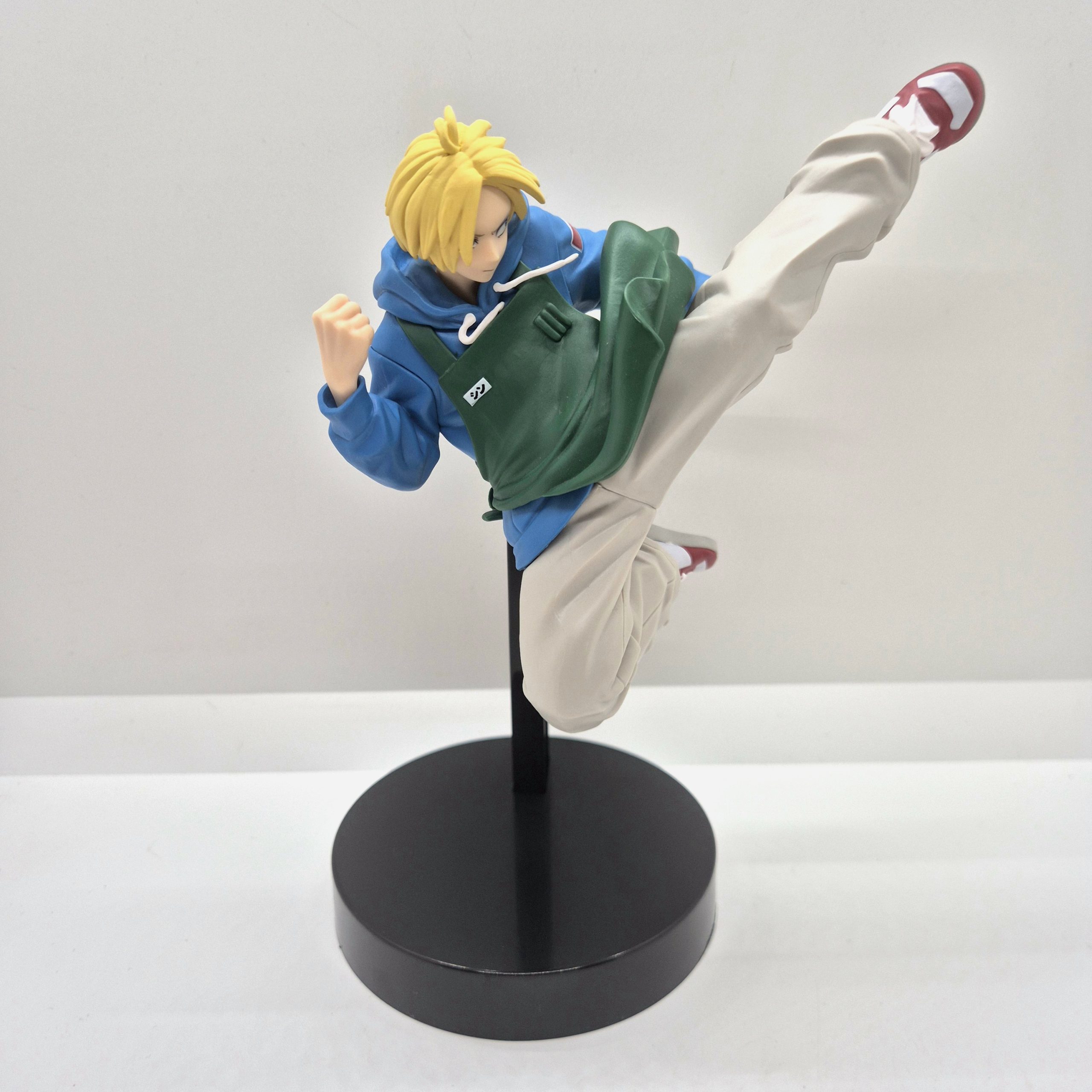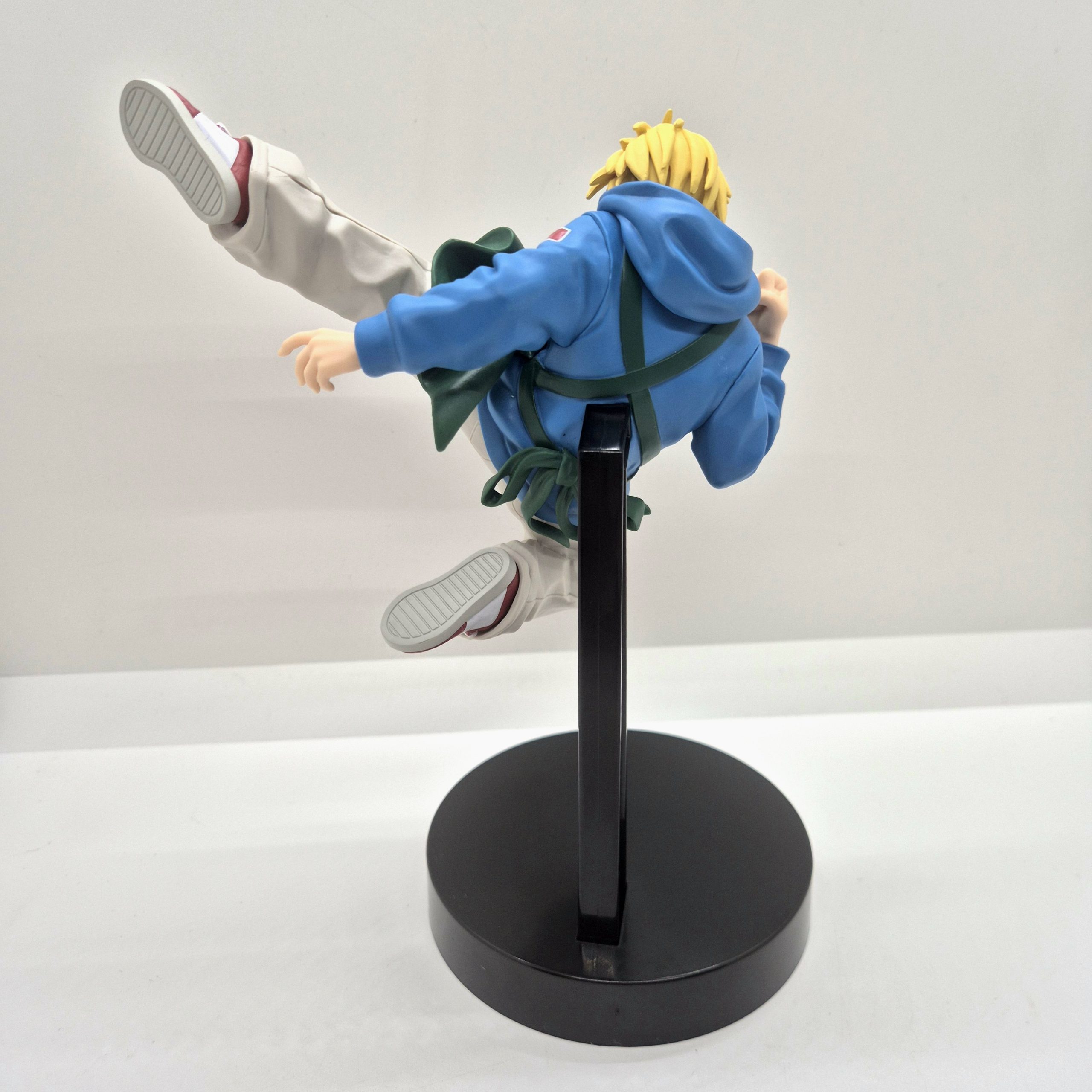 Il volto serio e concentrato di Shin riflette la determinazione tipica del personaggio, e l’ottima lavorazione del viso e dei capelli aggiunge profondità alla scultura. La base di supporto, di colore nero, sostiene con eleganza la posa a mezz’aria, dando solidità alla figura senza distogliere l’attenzione dal dinamismo della scena. Le pieghe dei vestiti e l’effetto movimento del corpo sono resi con cura, donando realismo e fluidità alla composizione. Alta circa 14 cm, questa figure è un vero omaggio all’agilità e al coraggio
