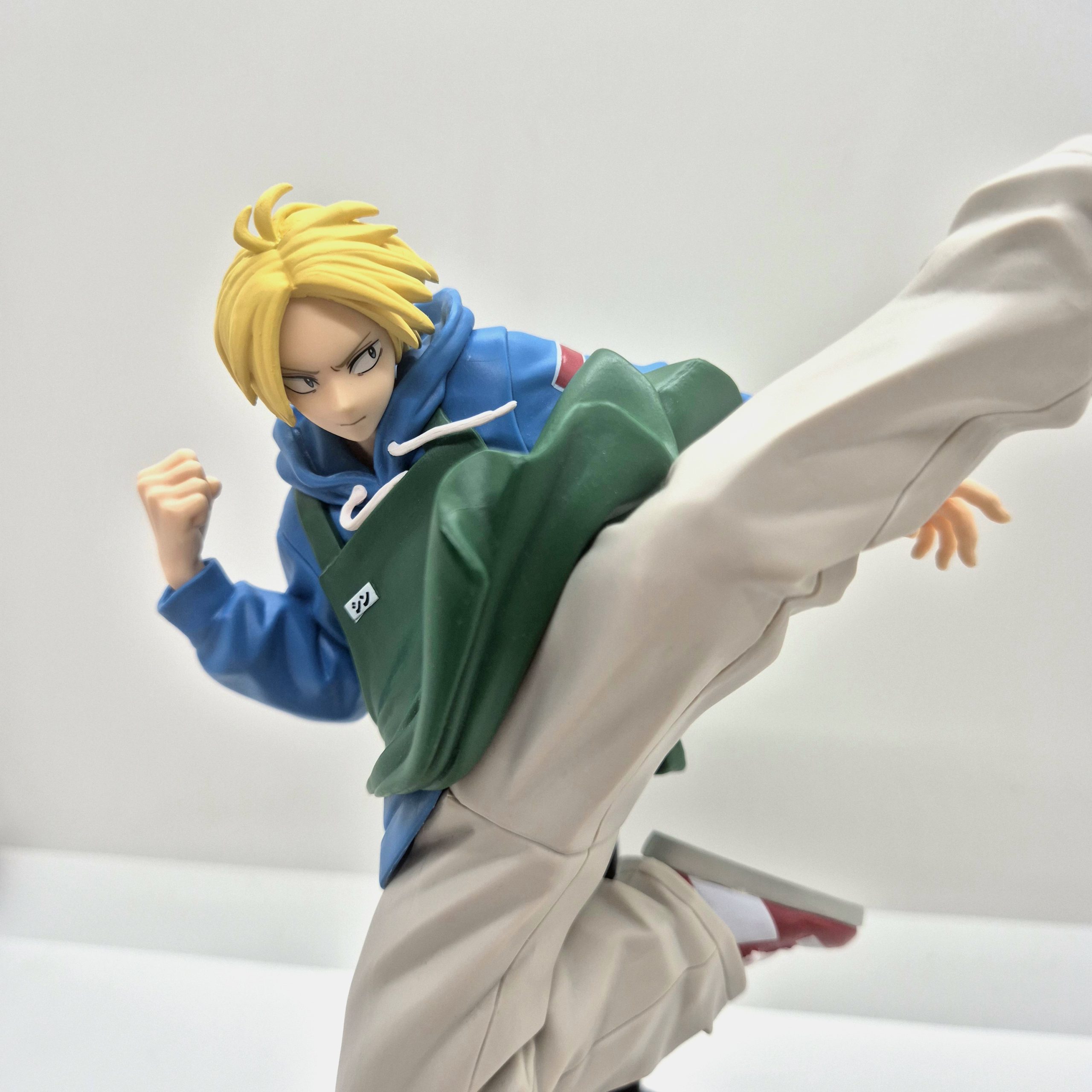 Shin è raffigurato in pieno slancio, sospeso in aria durante un calcio saltato. Il piede sinistro è teso in avanti, pronto a colpire con precisione, mentre il piede destro è piegato all’indietro, a enfatizzare lo scatto e la potenza del salto. Il braccio destro è proteso dietro e chiuso a pugno, conferendo alla figura una sensazione di forza trattenuta, pronto a esplodere. Il braccio sinistro, invece, è disteso lateralmente, usato per bilanciare il corpo e mantenere l’equilibrio durante il volo.