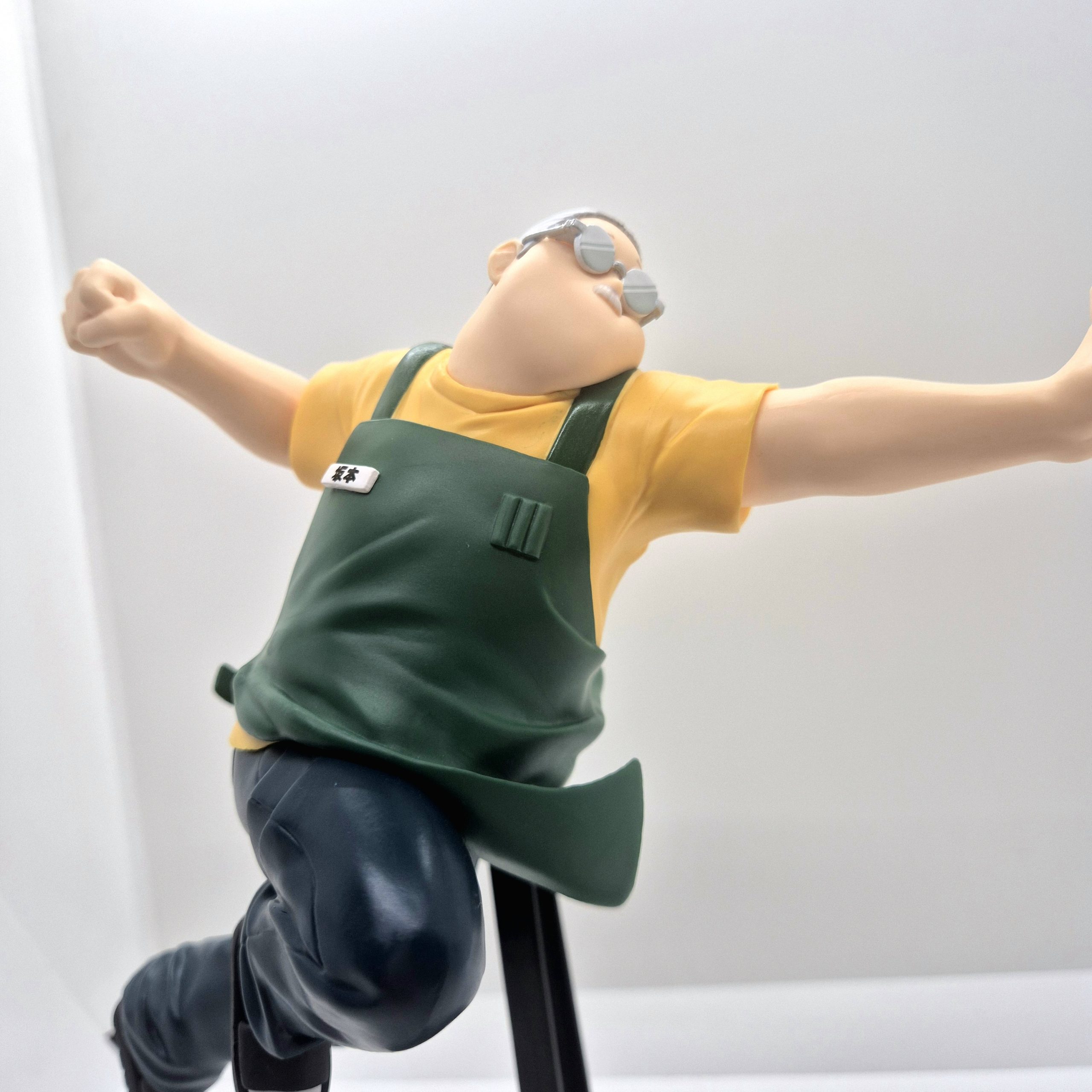 Raffigurato in un salto acrobatico, Sakamoto dimostra che, nonostante l’aspetto goffo e i chili presi dalla vita tranquilla, il suo corpo conserva l’agilità e la forza micidiale del passato. La mano sinistra è tesa in avanti, aperta, come a fendere l’aria o a prepararsi a bloccare un colpo, mentre il braccio destro è caricato per sferrare un pugno devastante, pronto ad abbattersi con precisione chirurgica. L’espressione sul volto è seria, determinata, quasi impassibile, tipica di chi sa di poter dominare ogni situazione con un solo gesto.