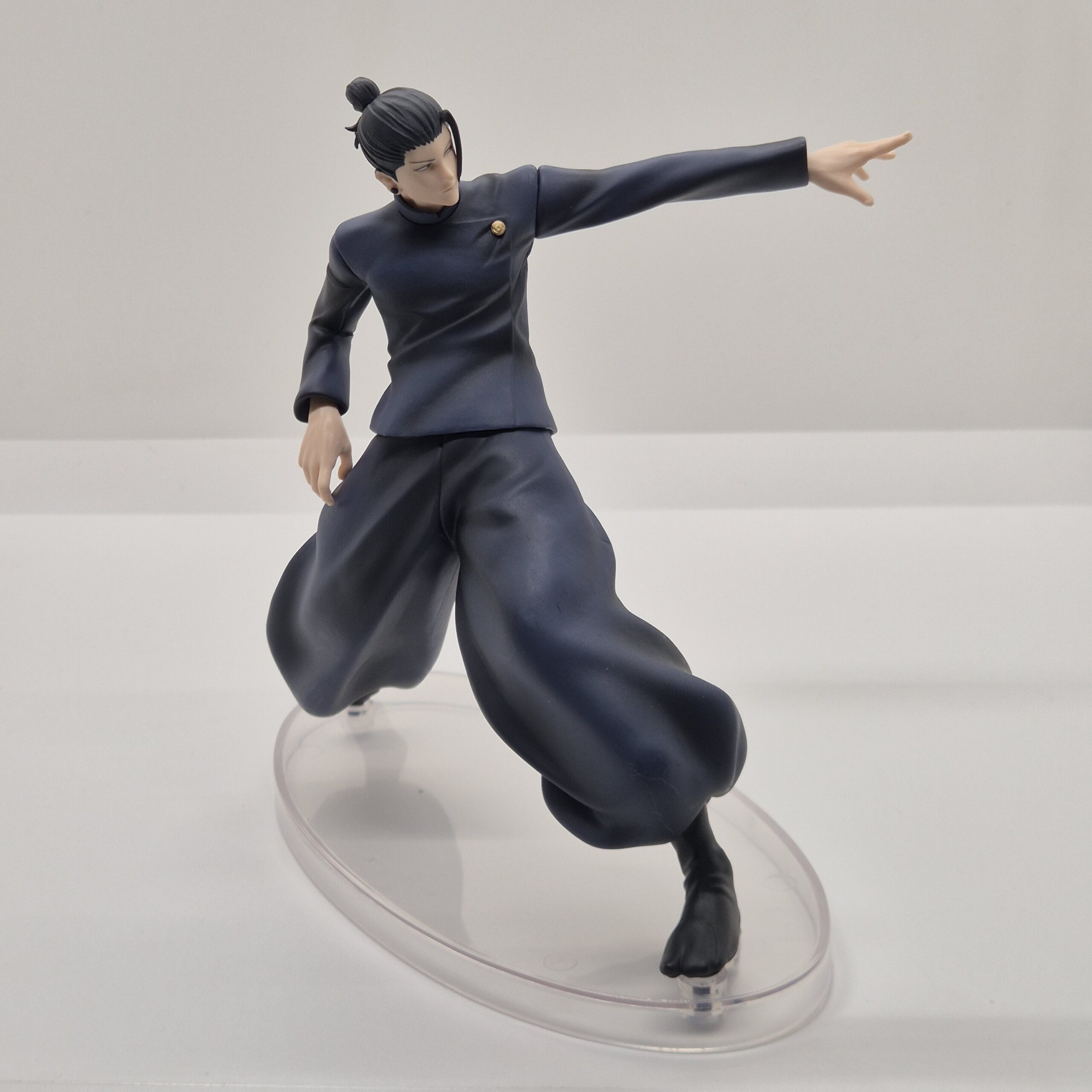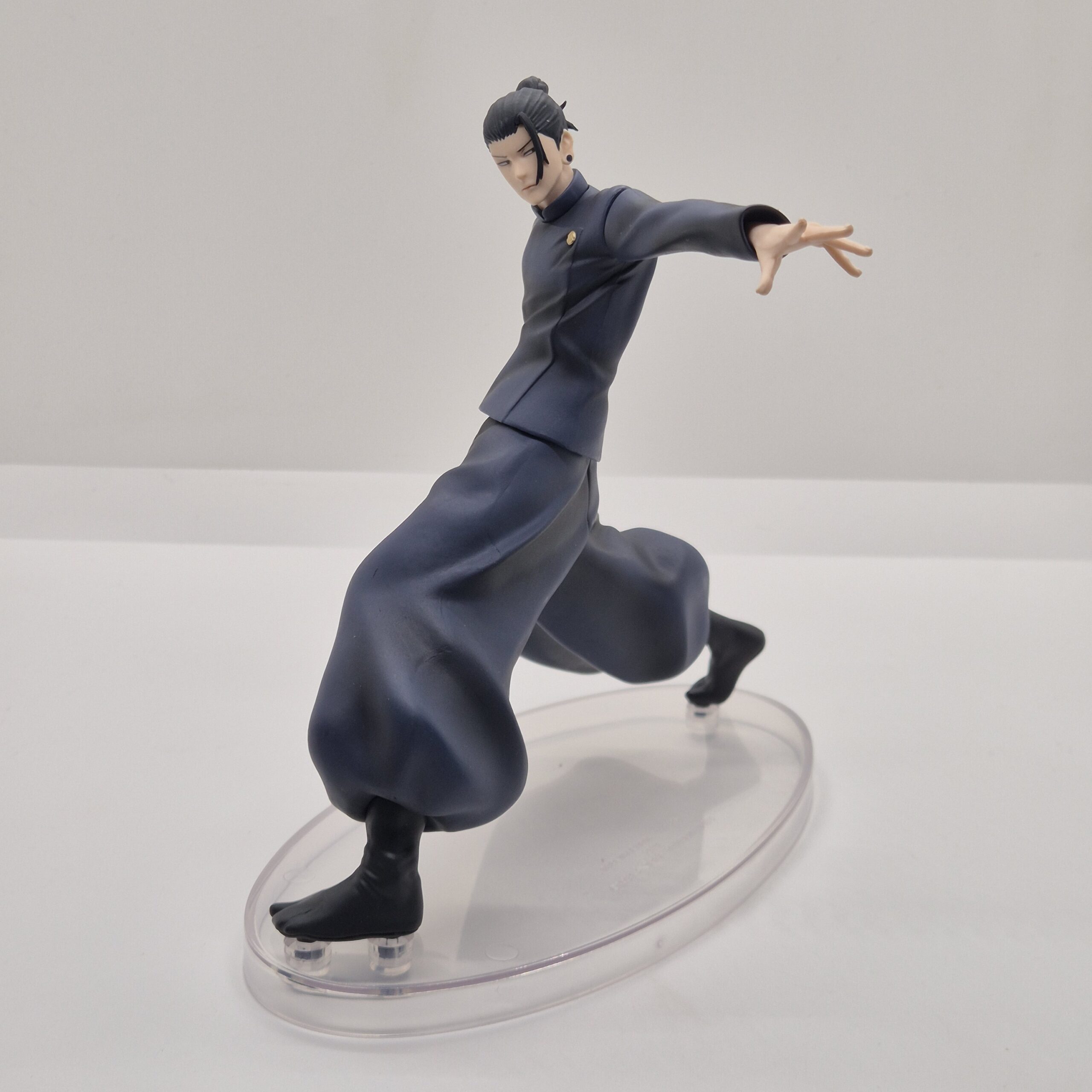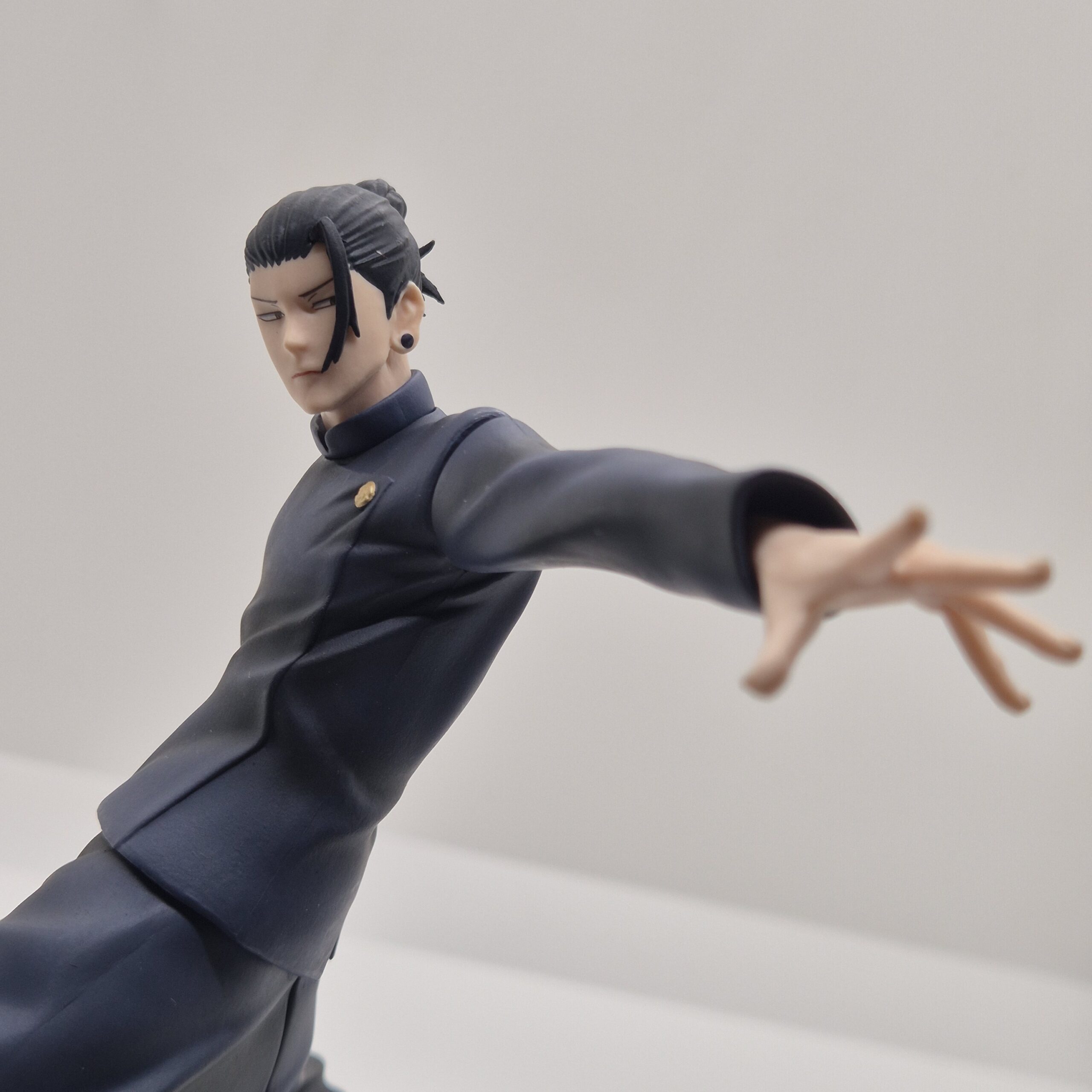 Geto è rappresentato con il suo classico abbigliamento scuro, elemento visivo che sottolinea il suo carattere serio e l’aura misteriosa che lo circonda. Il design della figura presta grande attenzione ai dettagli: pieghe dei vestiti, proporzioni e linee del volto sono resi con precisione, dando al personaggio un aspetto autentico e coerente con il suo design originale. Anche la postura scelta — rilassata ma non passiva — suggerisce una presenza pronta all’azione, con una tensione interna che sembra pronta a sprigionarsi da un momento all’altro.