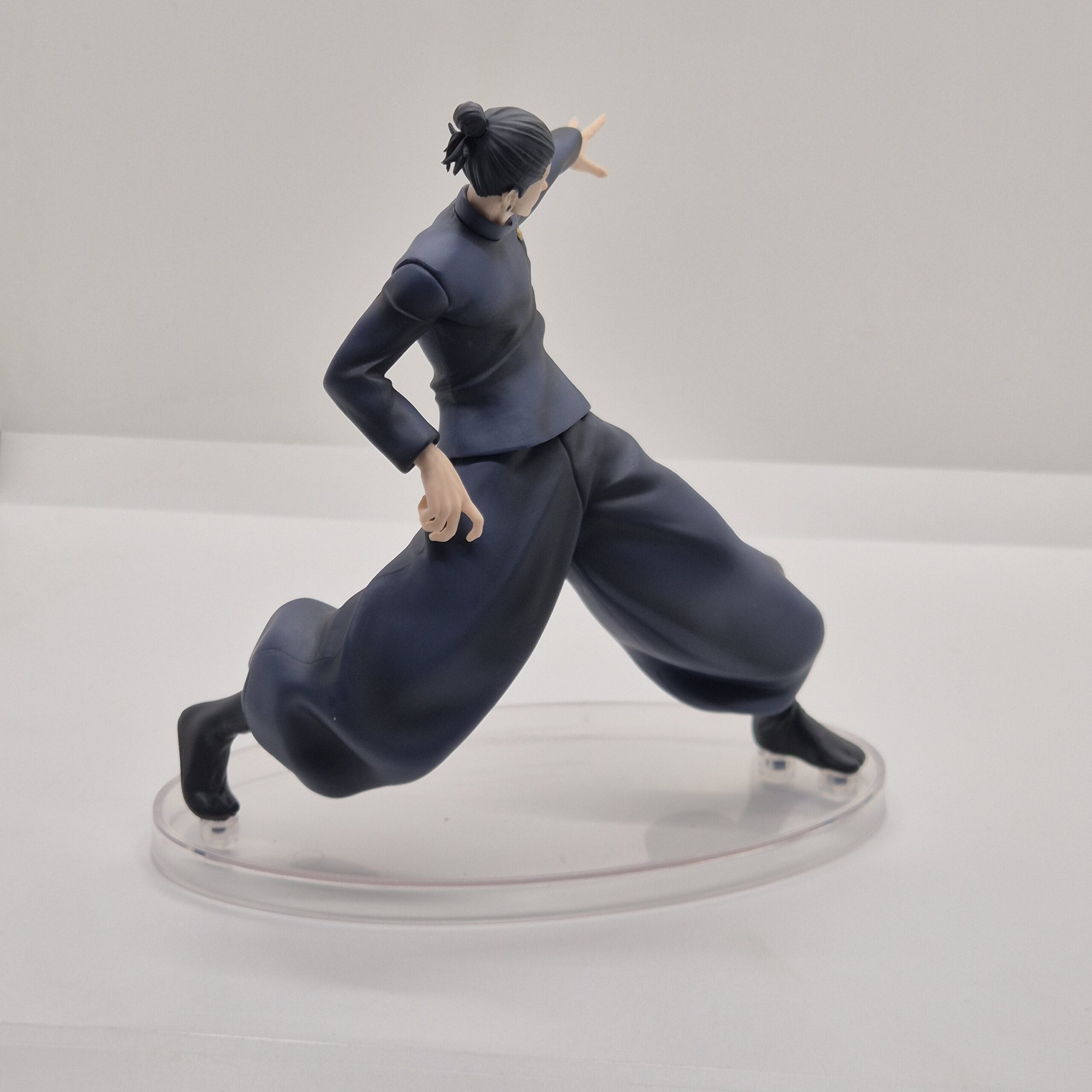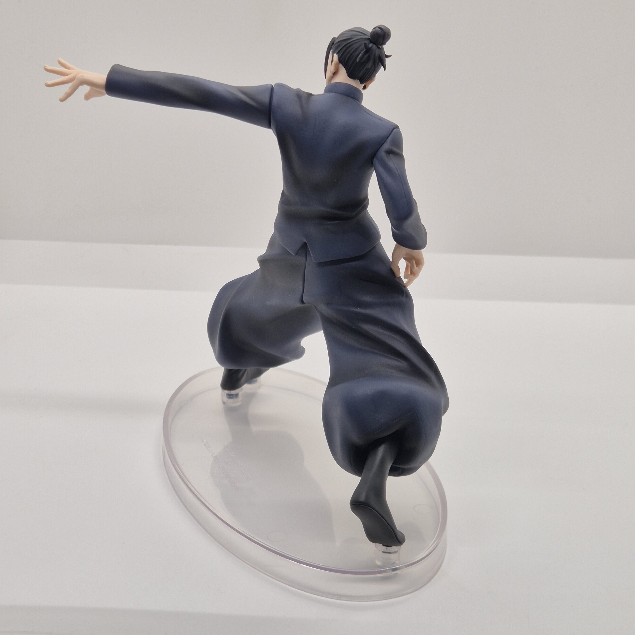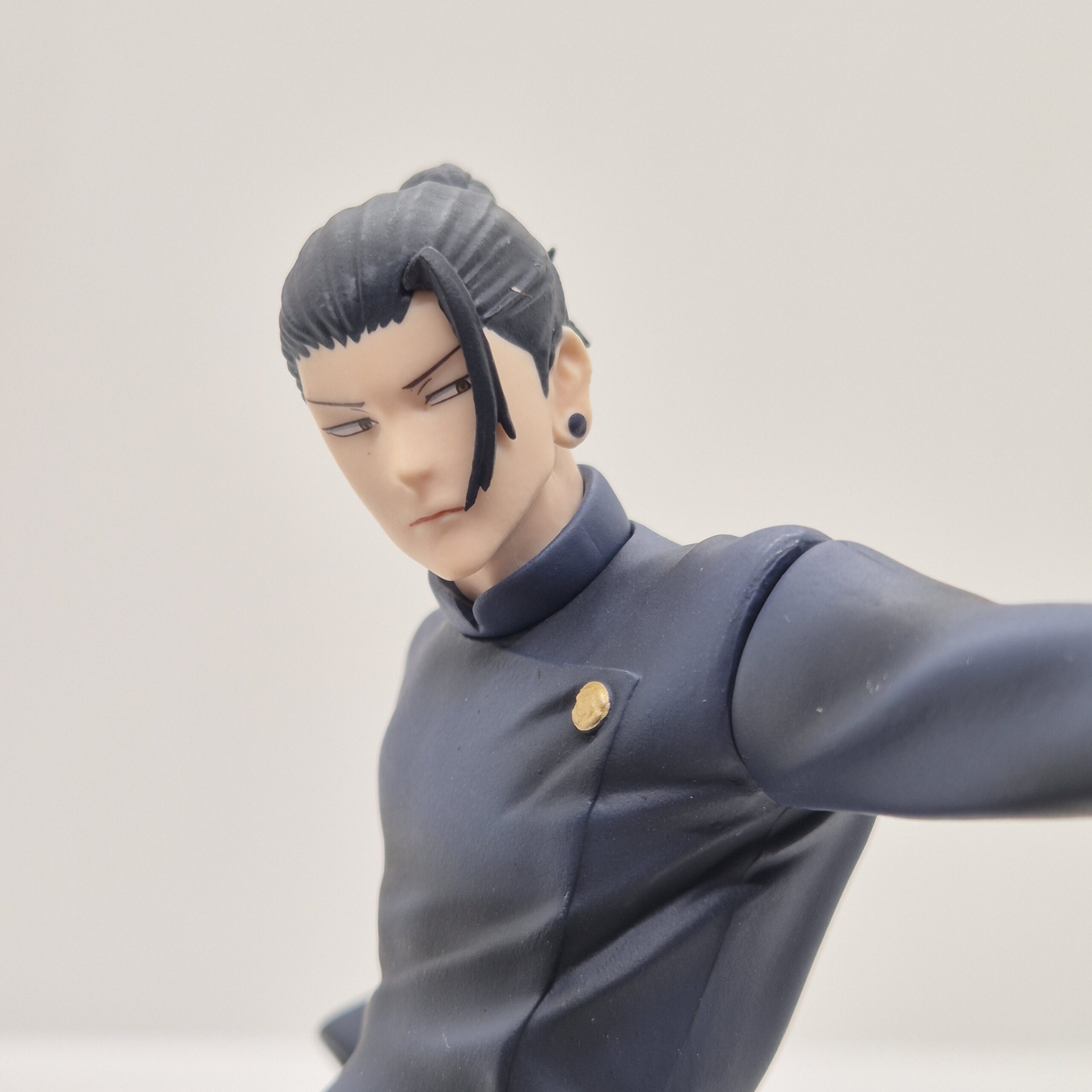 Geto è rappresentato con il suo classico abbigliamento scuro, elemento visivo che sottolinea il suo carattere serio e l’aura misteriosa che lo circonda. Il design della figura presta grande attenzione ai dettagli: pieghe dei vestiti, proporzioni e linee del volto sono resi con precisione, dando al personaggio un aspetto autentico e coerente con il suo design originale. Anche la postura scelta — rilassata ma non passiva — suggerisce una presenza pronta all’azione, con una tensione interna che sembra pronta a sprigionarsi da un momento all’altro.