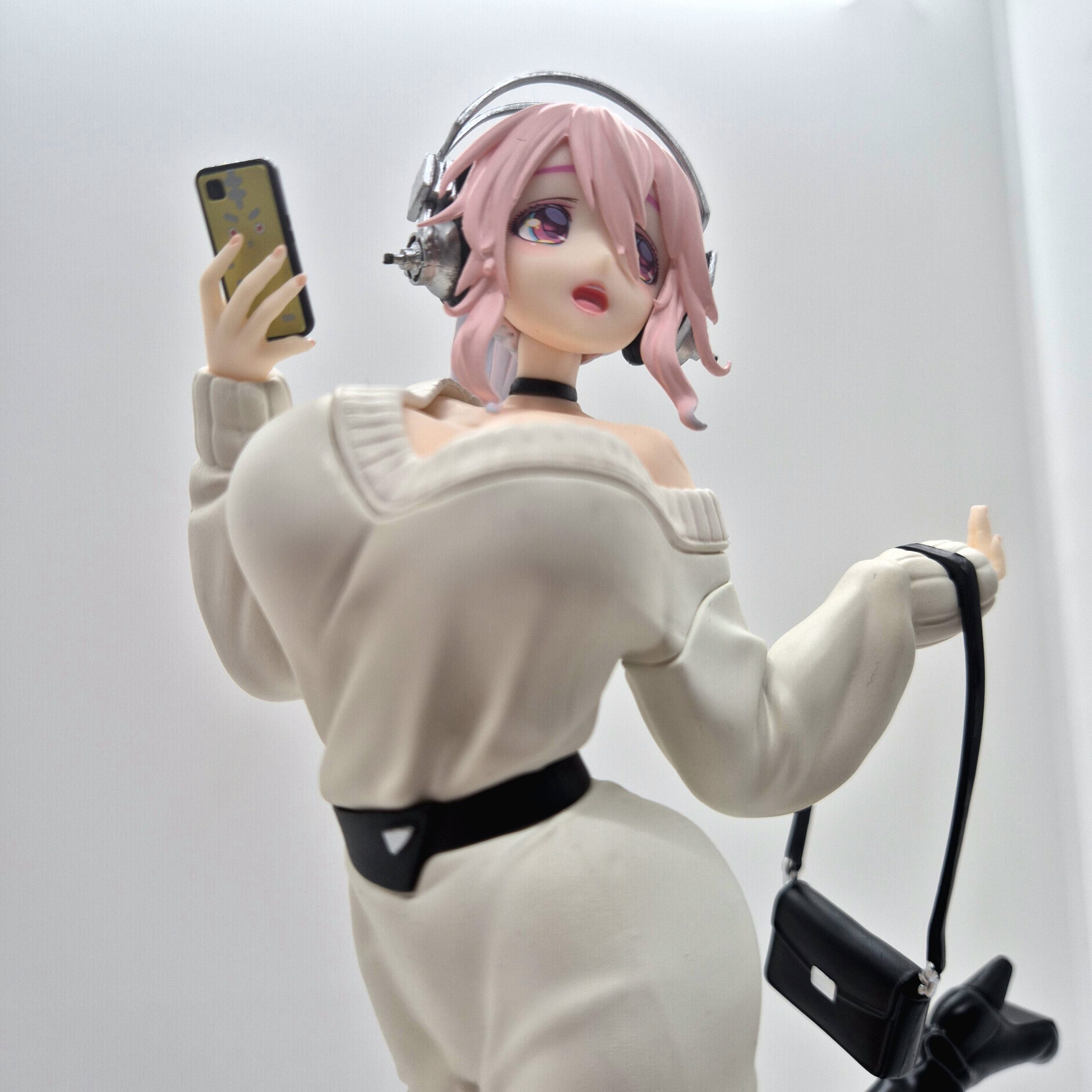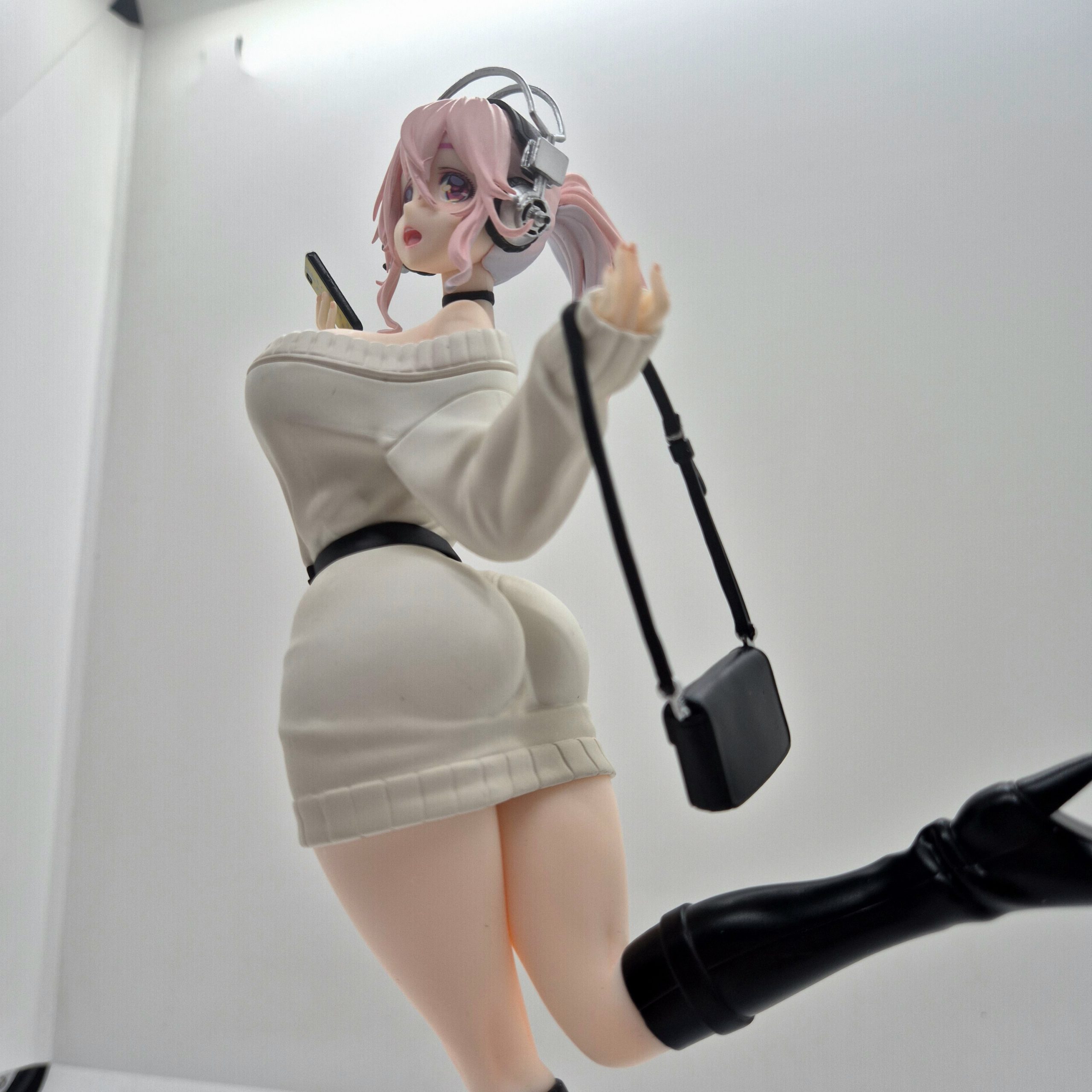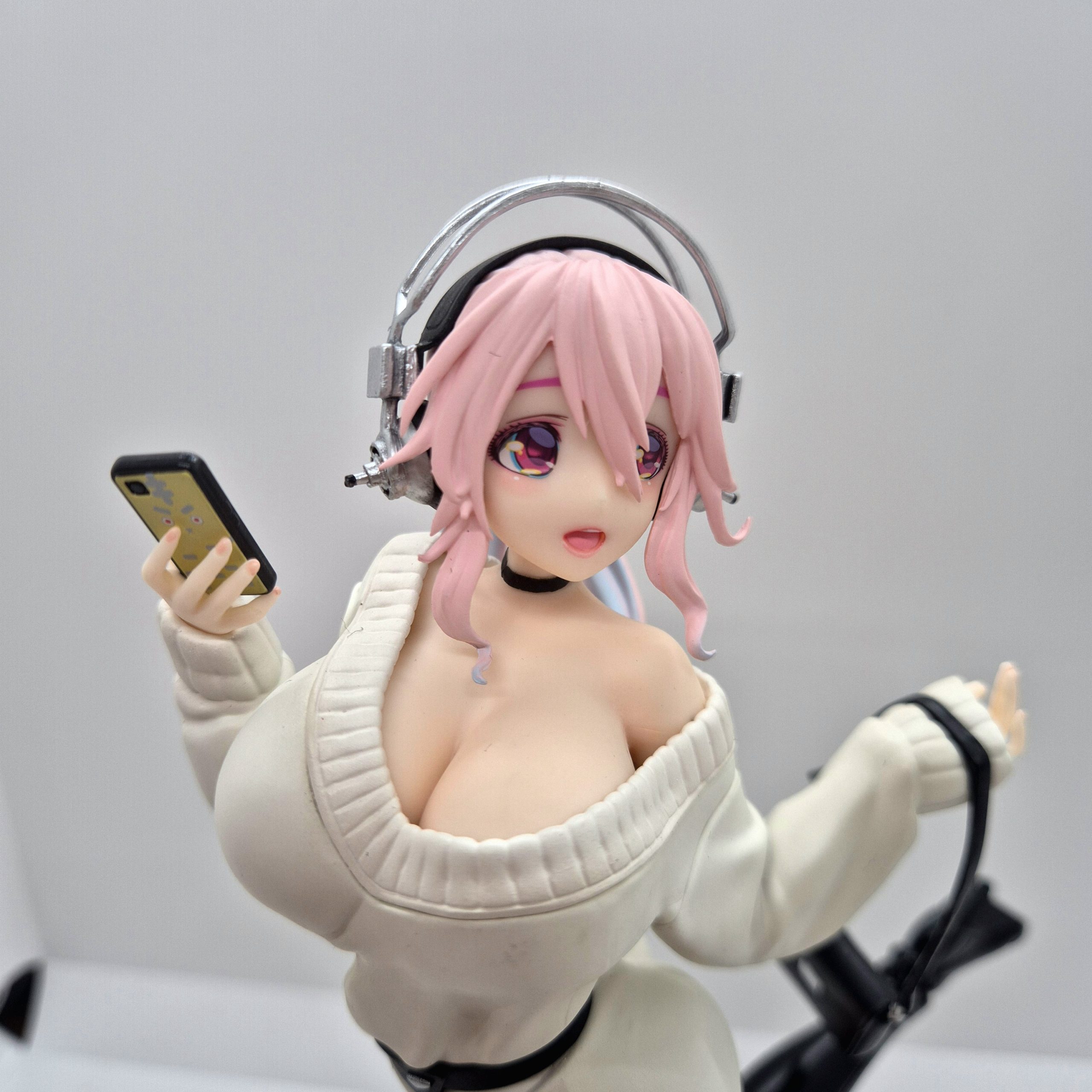I suoi iconici cuffie nere e i lunghi capelli rosa, acconciati in codino laterale, conferiscono carattere e riconoscibilità all’insieme. L’attenzione al paintwork è evidente nella sfumatura dei capelli, nel contrasto tra maglione e stivali, e nella cura del volto: occhi rossi grandi, guance lievemente rosate e sguardo accattivante catturano l’energia e la dolcezza di Sonico.